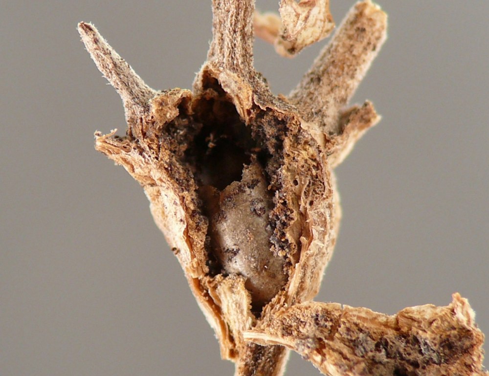 Forms a gall in the upper stem. I observed two examples in August and a third in September, and found at least one additional, uninhabited example on a dead stem in winter. All of these galls were formed at a node on the upper stem, with the growth of the stem and leaves above the affected node becoming stunted. One of the August galls was ovoid, roughly 10-12mm long and ~8mm wide, and the other was about the same size but with a somewhat less pronounced swelling. The inner walls of the August galls were rough-textured with a dark brown color, and each gall contained a modest amount of granular frass accumulation and an intact tephritid puparium. The puparia were a yellowish-brown color overall with the anterior end darkened to nearly black. The gall observed in September had ruptured, perhaps in part as a result of the adult fly's recent emergence, resulting in the blackened gall interior becoming partially exposed, which revealed the spent puparium inside. Despite this large exposed wound, the leaves issuing from the node and the short length of stem above the node were still alive. The gall found on a dead stem in winter also displayed a large hole resulting from the adult's emergence in the previous summer, and the empty puparium was still inside the gall.