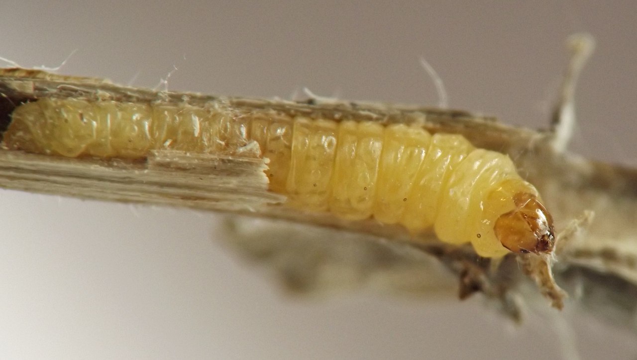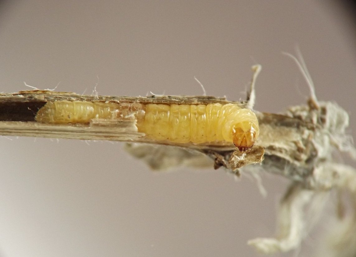 I found a larva in its tunnel in the interior of an upper stem of common ragweed near the stem tip. There was no obvious swelling to the affected stem. The tunnel spanned most of the stem diameter and filled the upper 80-90mm of stem, with the lower 70mm of stem unaffected. The larva dwelled at the upper end of the tunnel with a ~20mm-long rod of compacted solid frass immediately below it. The larva was a sunny yellow color with an orange-brown head capsule. It pupated in the stem and the pupa was thrust through the outer wall of the stem when the adult emerged.