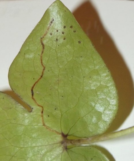 This mysterious insect begins feeding in the leaf blade of hepatica, where it creates a short, linear, dark brown mine that soon enters the petiole. The mine then proceeds straight down the petiole and disappears into the belowground parts of the plant, where the larva presumably does most of its feeding.