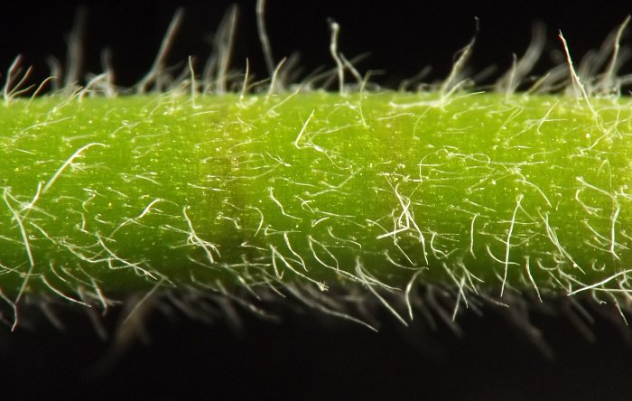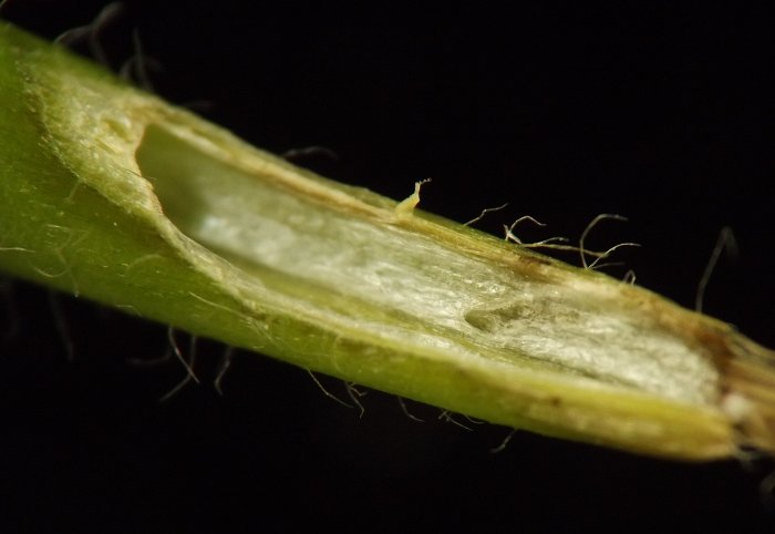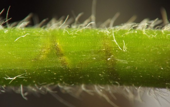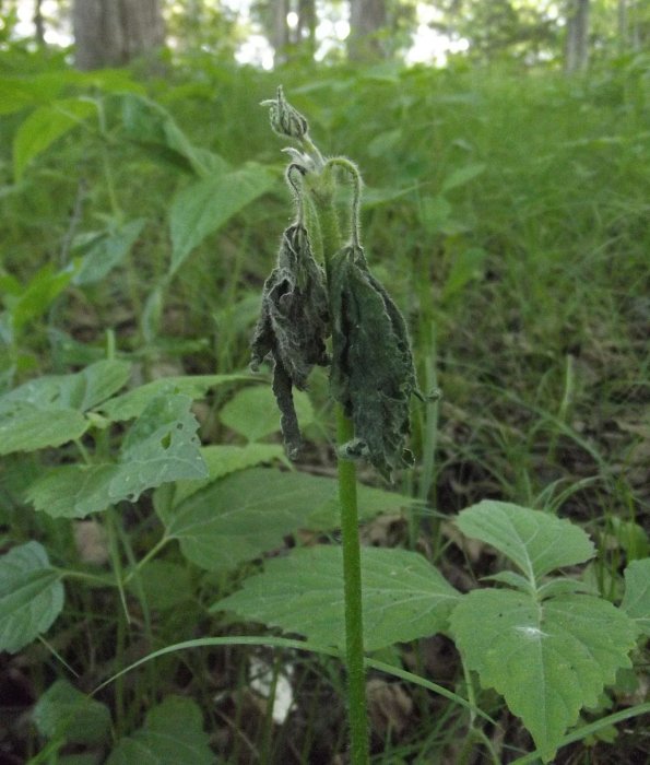 I have generally found plants inhabited by this agromyzid in relatively open upland woods. Larvae tunnel in the whitish tissue lining the stem interior of the thimbleweed host. From what I have observed, they feed in early to mid-June, before the hostplant has reached maturity. Early in their tunneling activities, some larvae girdle the shoot near its apex by tunneling shallowly around its circumference in a spiral pattern. Leaves above this girdled area may wilt or shrivel, providing a straightforward way for interested humans to locate inhabited stems in the field. After this initial work, larvae proceed into deeper tissues of the stem, and finish feeding at the base of the stem.
