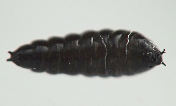 The one larva I examined closely and photographed was elongate, cylindrical, and pale yellowish-white in color. Its posterior spiracles were black in color and borne on short pale lobes projecting rearward from the posterior end of the terminal segment. The upper arm of the rearmost portion of the larva's cephalopharyngeal skeleton did not appear as if divided in two, suggesting this agromyzid belongs to subfamily Phytomyzinae (see Ellis 2024).