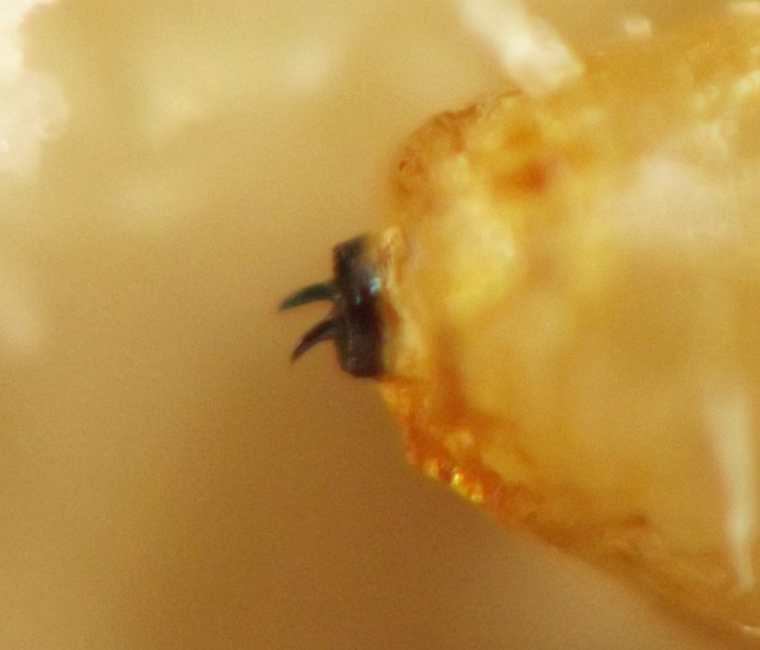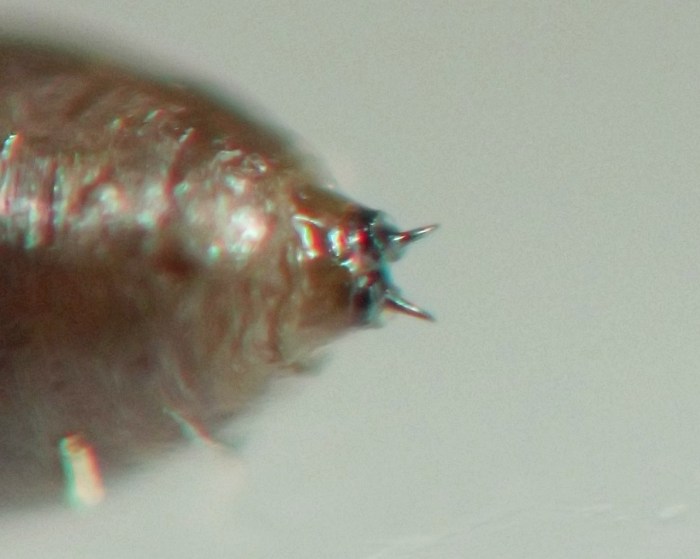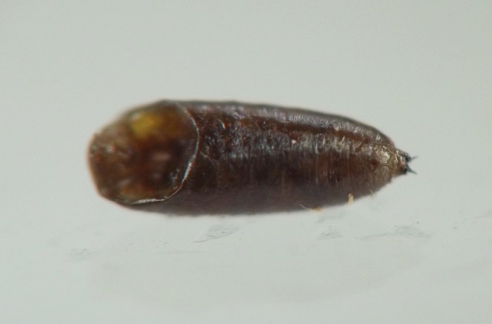 In both the October and the January examples, the posterior spiracular plates of the puparium were black in color, separated by less than half their width (almost touching in the October example), and ornamented with strong, curved black horns.