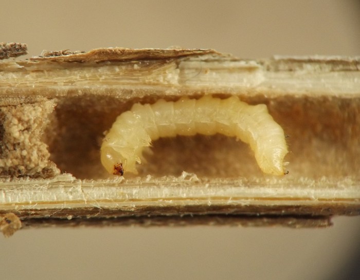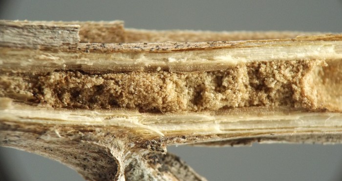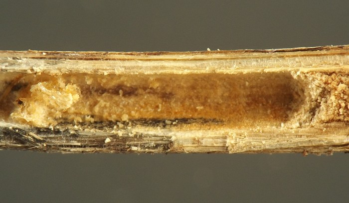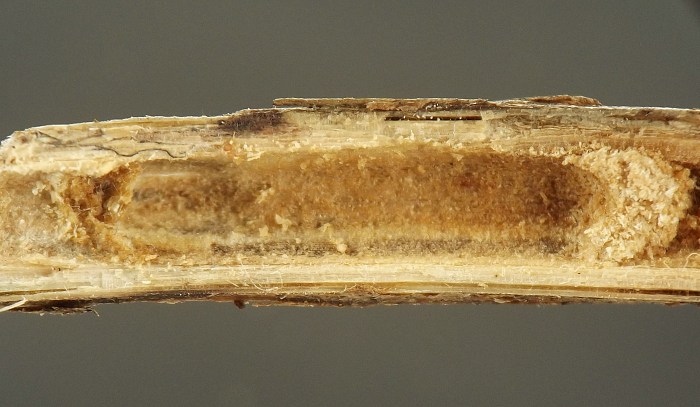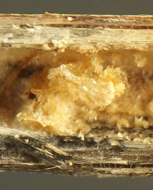 The larva in the photos below, found overwintering in a dead stem of the host, occupied a relatively short (length ~80mm) chamber in the upper stem from which nearly all the pith had been consumed; the lower end of the chamber had been filled with a significant amount of compacted frass. Pupation occurred in this chamber and the adult emerged in spring. Mordellistena convicta and Mordellina pustulata have been previously reared from this hostplant in the Upper Midwest (Lisberg and Young 2003).