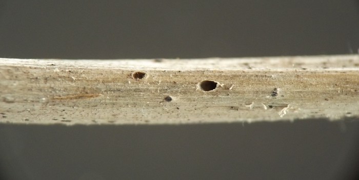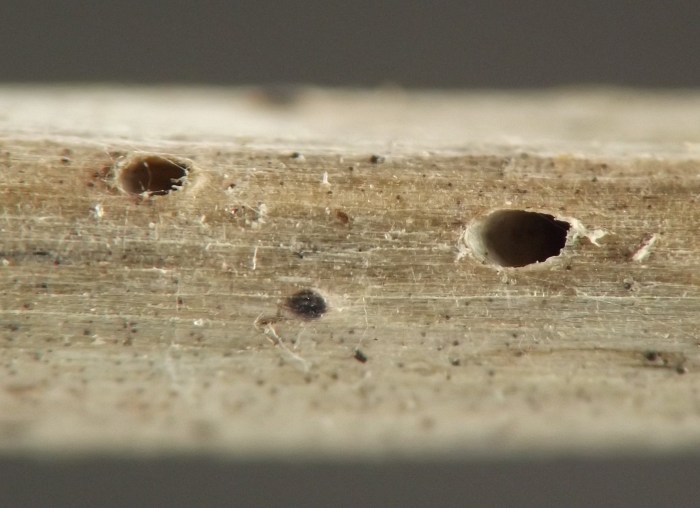 The upper portion of a dead stem of the host that I examined in winter 2022 contained two tiny, oval holes in its exterior. Dissecting the stem at this point revealed a white cocoon at each hole, with the anterior end of the cocoon opening directly through the hole. I did not observe any larvae, pupae, or adults directly, but the shape, color, size, and texture of the cocoons, along with the faint blackening of the stem interior tissue adjacent to them and even on one of their surfaces, were all strongly suggestive of a cecidomyiid. Given that the cocoons were empty in winter, the adults must have emerged during the same growing season in which they grew to maturity as larvae.