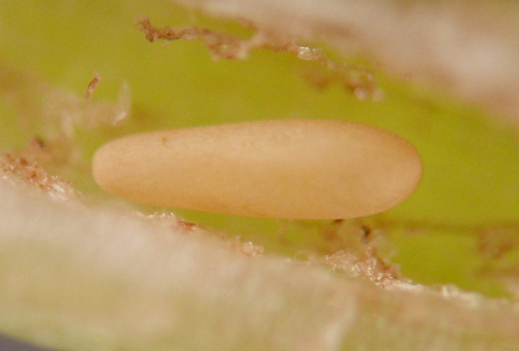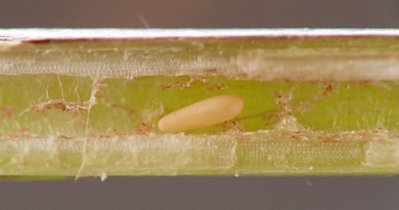 In the final days of June 2024, I collected a stem of the host that contained a small but externally visible oviposition scar, accompanied by an egg in the stem interior. The scar consisted of an oval area, roughly 7 mm long by 4 mm wide, from which the outermost layers of stem tissue had been scraped away to produce a flat-bottomed depression, with a small round hole about 1 mm in diameter situated in the center of the oval and penetrating into the stem interior. The egg was smooth and tan in color, cylindrical, and broader and more rounded on one end, tapering along its length to the narrower, more blunted opposite end, the whole egg about 3.5 times as long as its average width.