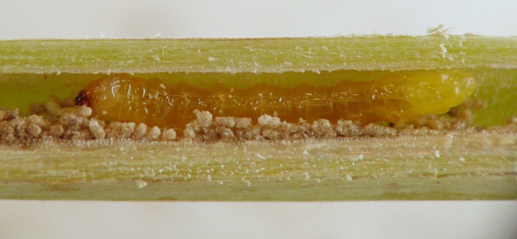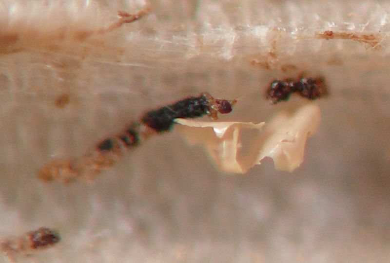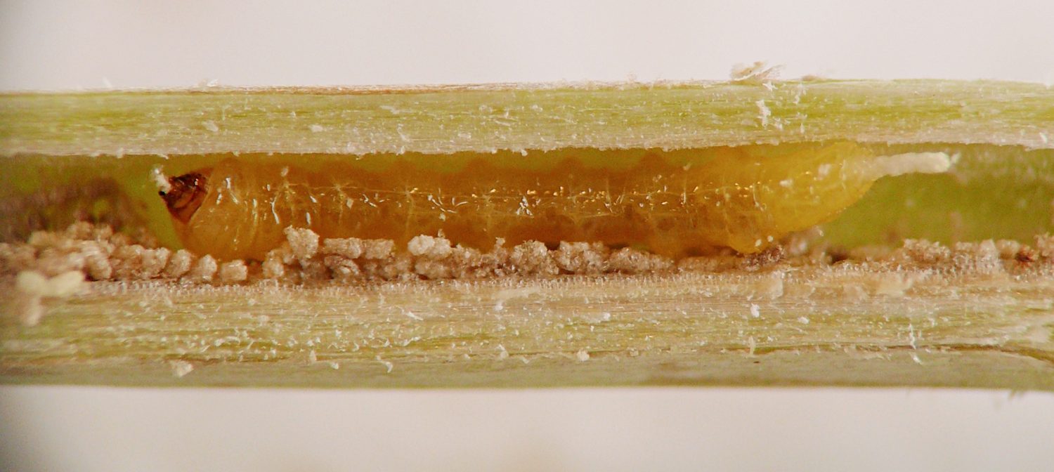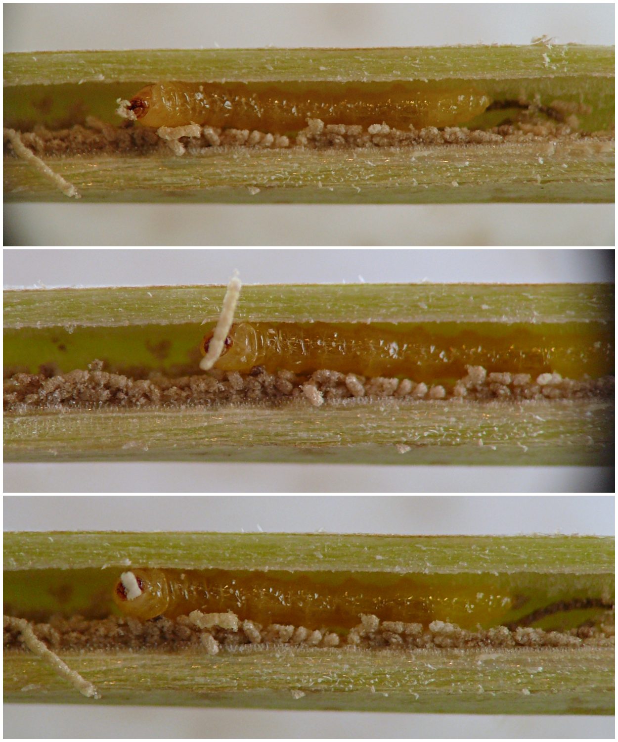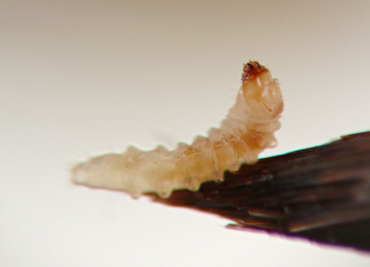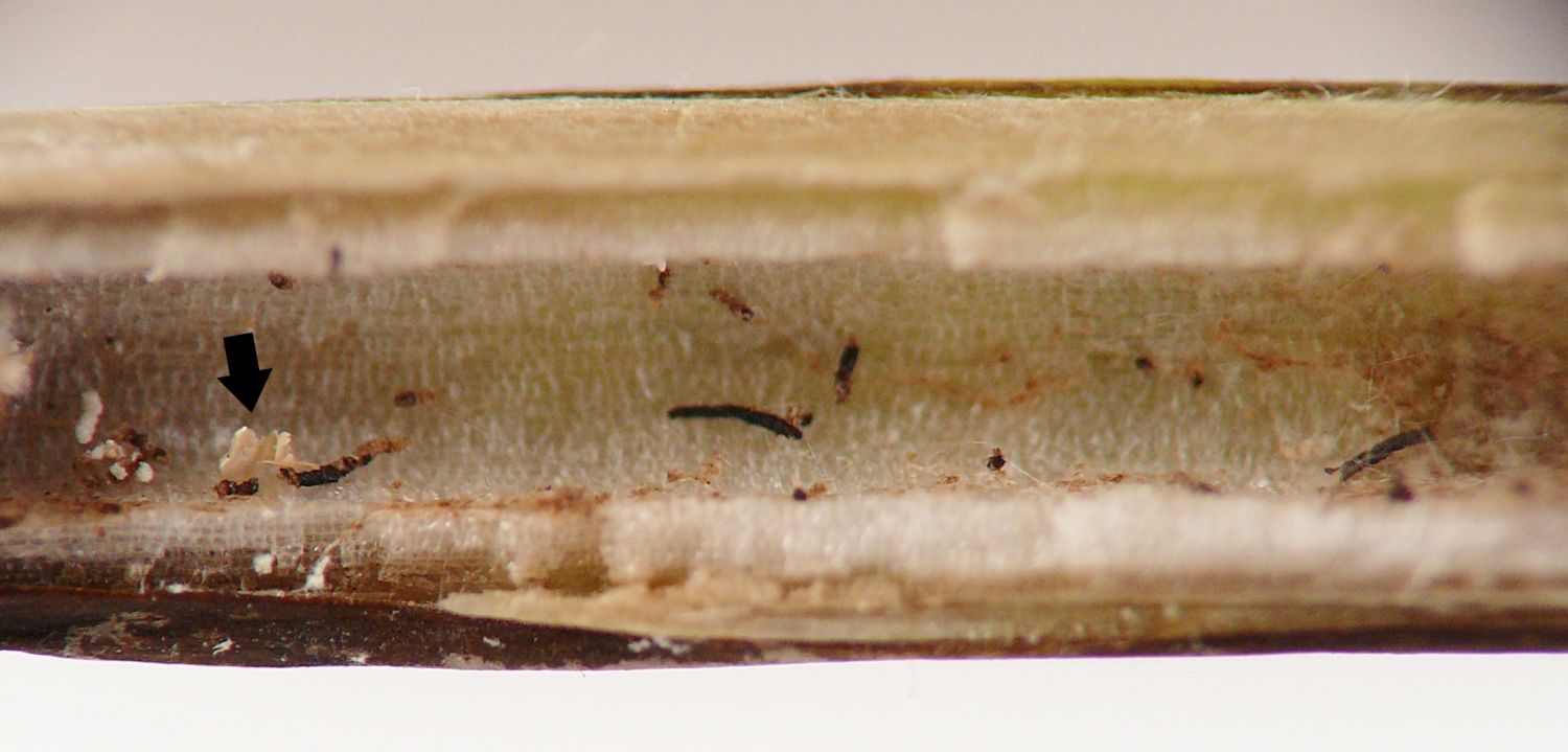 I stored the section of stem containing the scar and egg in a container with another section of Monarda stem from a different individual plant. When I inspected the container and dissected both stem sections several days later, I found that the egg in the first stem section had hatched, leaving behind tattered chorion remnants where the egg had been resting in the stem interior. The hatchling larva had evidently fed on the pith lining the hollow stem interior, based on the presence of several thin, elongate rods of black frass, along with a few white airy frass pellets that appeared to consist of stem pith that had been only minimally processed as it moved through the larva's digestive system. In the bottom of the rearing container was a very young cerambycid larva that was small enough to have recently hatched from the egg and produced the accompanying frass. The second stem section contained an erotylid larva (record 0338). Though I could not completely rule out the erotylid larva's involvement, I concluded that the cerambycid larva had most likely hatched from the egg in the first stem section, fed for a short time in the interior of the stem, then tunneled downward and out of the stem section, ending up on the bottom of the container.