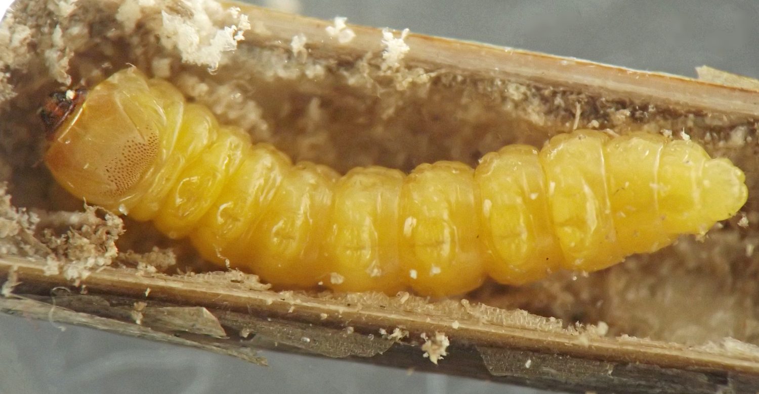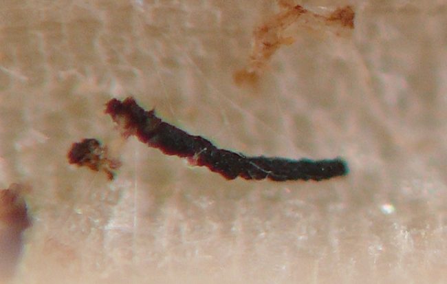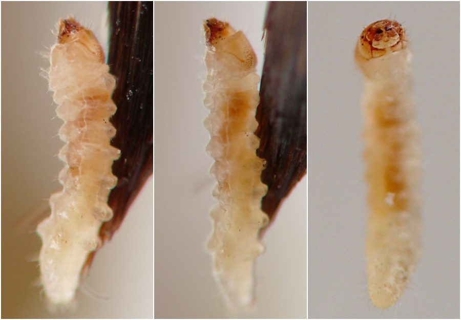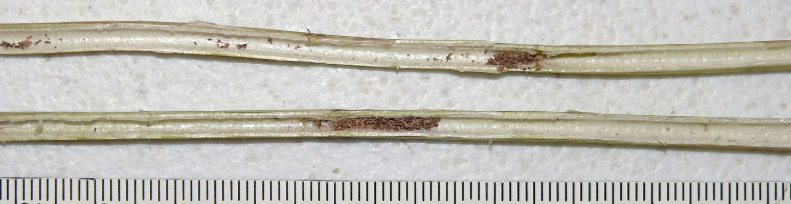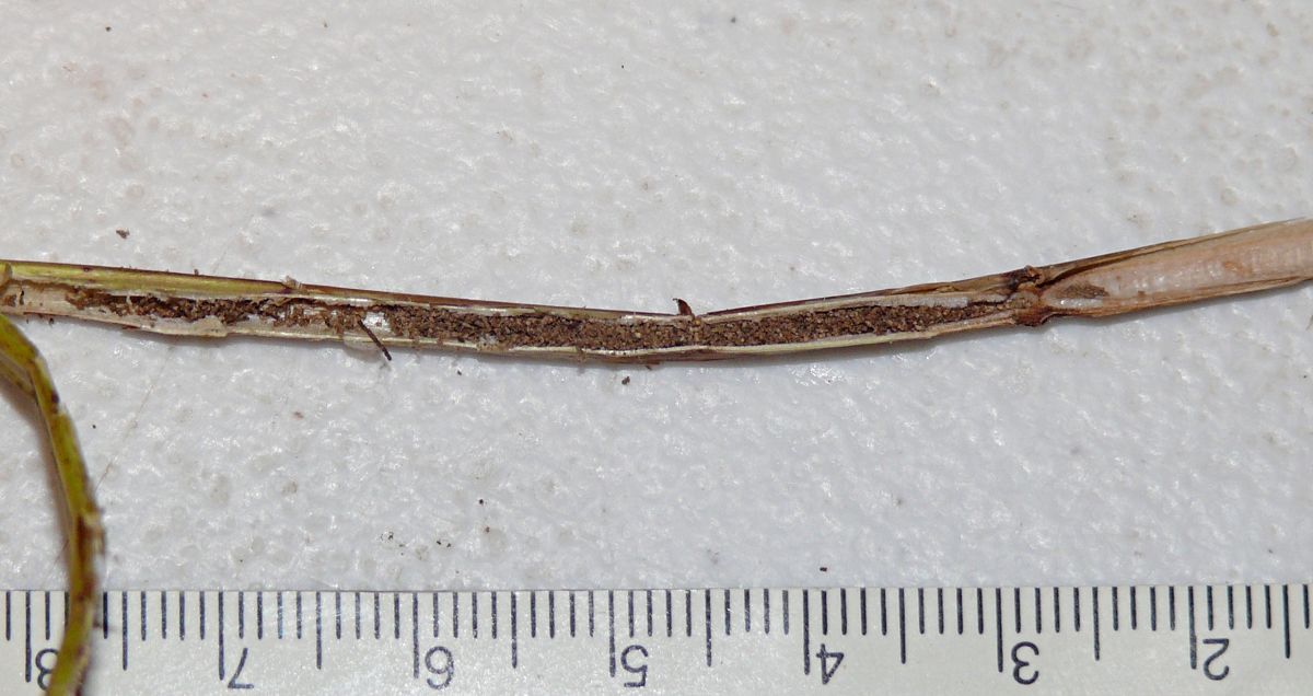 Finally, in mid-August 2024 I found another Monarda stem with a cerambycid larva inside. Sclerotized areas of the larva's head and prothorax, though larger and more developed, were otherwise reminiscent of those belonging to the June larva. High in the affected stem were a few places where the larva had gathered its frass into loose clumps, while the lower stem hosted a larger and more dense accumulation of frass along with the larva itself. The frass consisted of dry, light brown, short-cylindrical pellets, very similar to those of the March larva, with some of the pellets affixed end-to-end in chains up to 2 or 3 mm long.