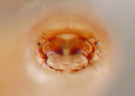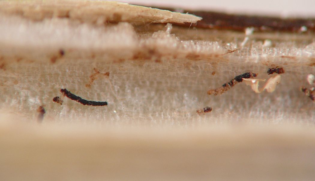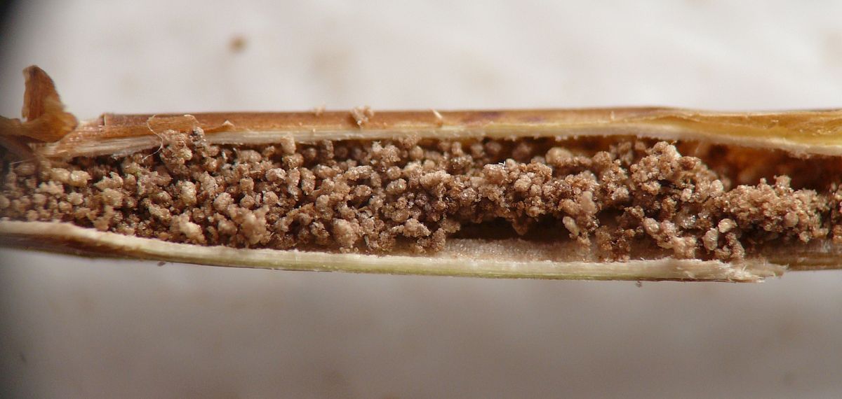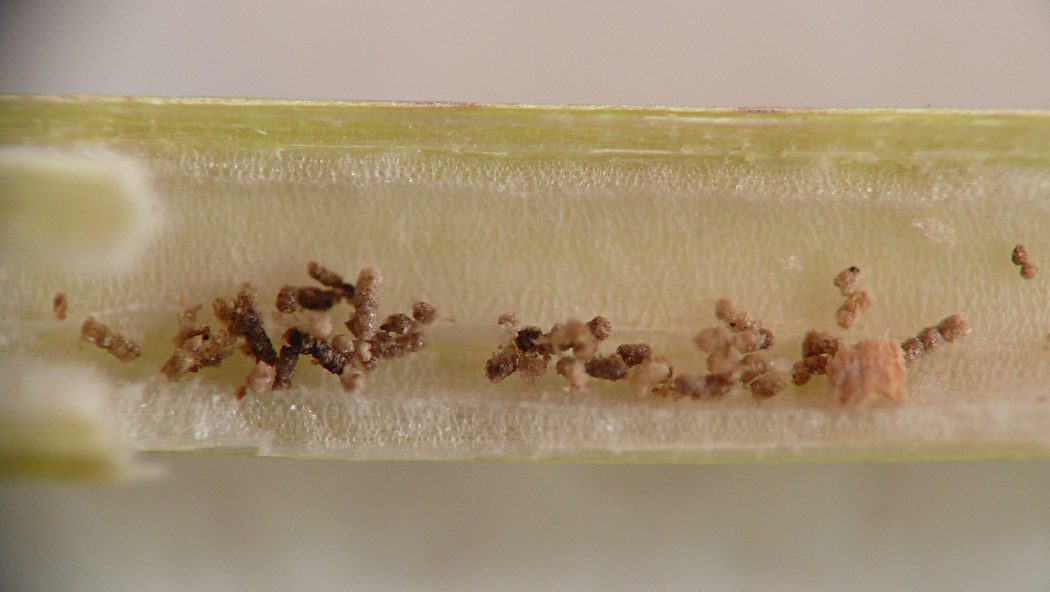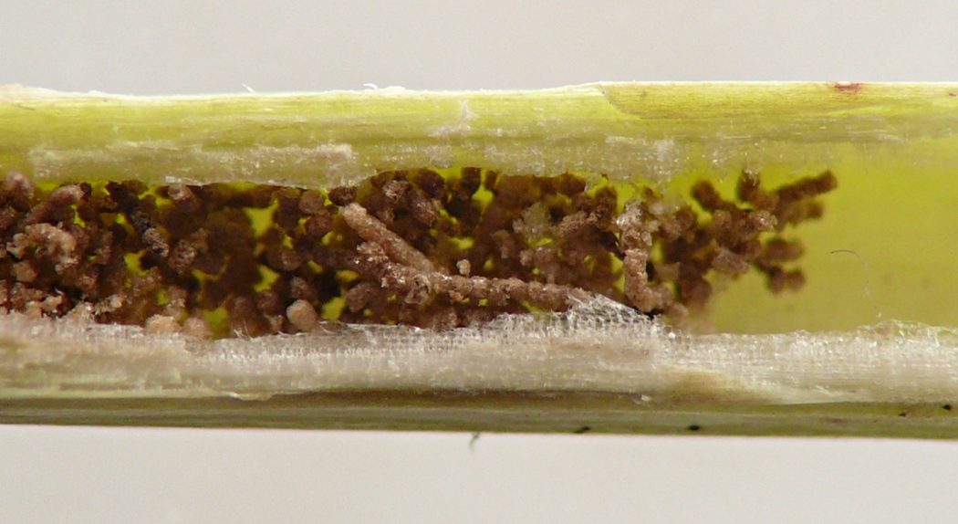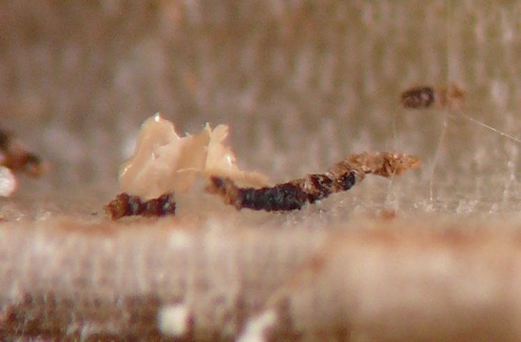 Finally, in mid-August 2024 I found another Monarda stem with a cerambycid larva inside. Sclerotized areas of the larva's head and prothorax, though larger and more developed, were otherwise reminiscent of those belonging to the June larva. High in the affected stem were a few places where the larva had gathered its frass into loose clumps, while the lower stem hosted a larger and more dense accumulation of frass along with the larva itself. The frass consisted of dry, light brown, short-cylindrical pellets, very similar to those of the March larva, with some of the pellets affixed end-to-end in chains up to 2 or 3 mm long.