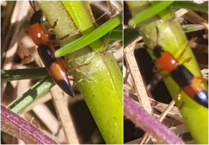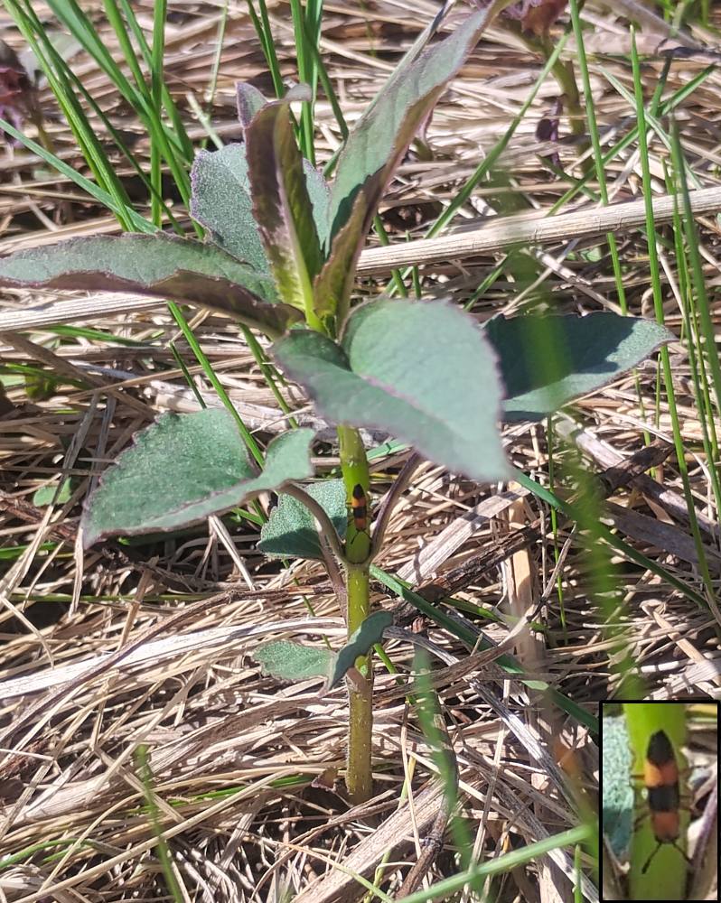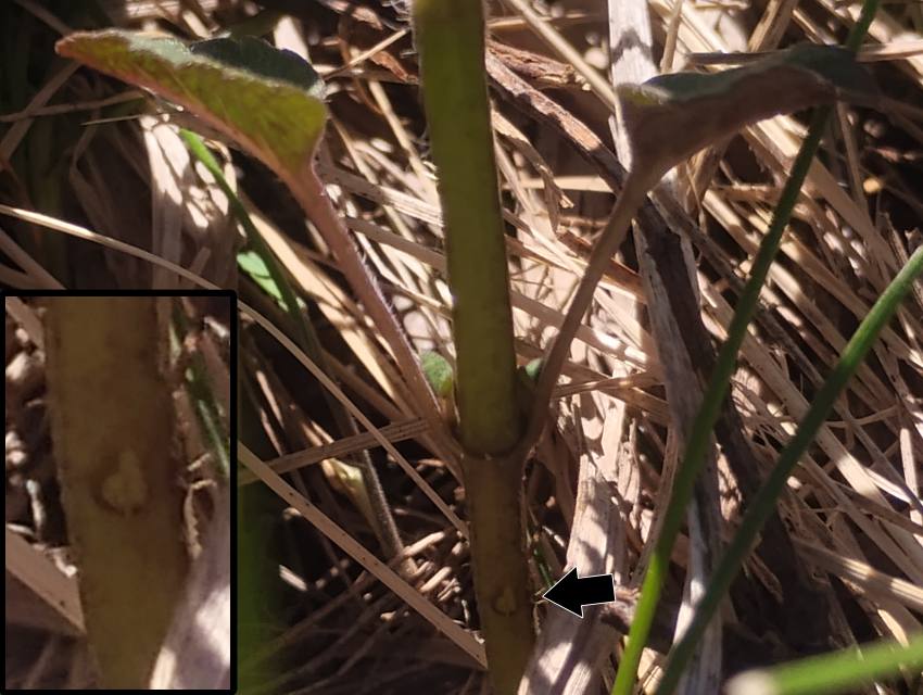 I also observed a hole in the lower portion of the 16 April 2026 shoot near ground level (image 338-24), but I could not definitively link this to the presence of the adult beetle. On further reflection, though I had no clear evidence for this, the presence of the hole made me wonder if there was any possibility the beetle could be guarding the stem after having laid an egg in it. Chaboo and McHugh (2010) note that several authors have documented maternal guarding of offspring in Erotylidae, and while "guarding of egg clutches has not been described for any erotylid species, [it] could be predicted from the observed guarding of larvae" (p. 116). A perhaps simpler explanation in this case is that the beetle I observed was planning to lay an egg in this stem after having sought it out it as an ideal choice among the Monarda stems available to it, and thus it did not wish to abandon the stem.