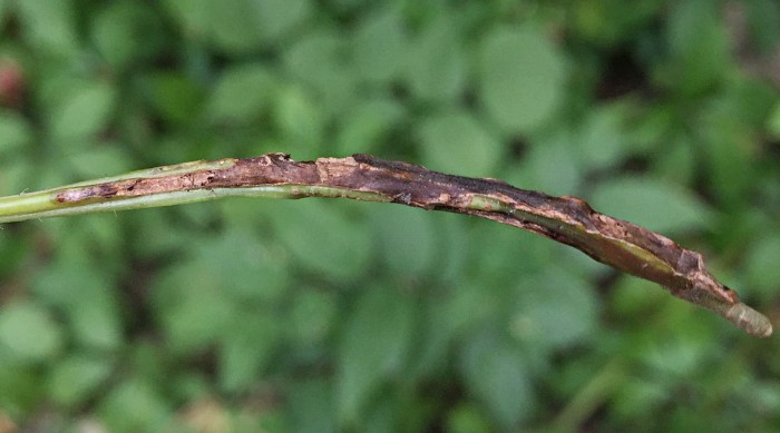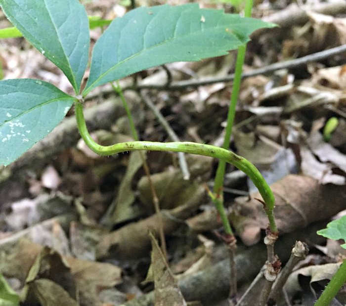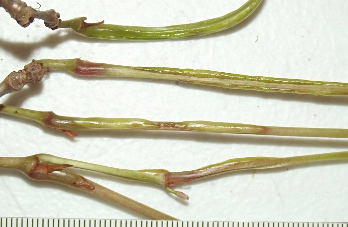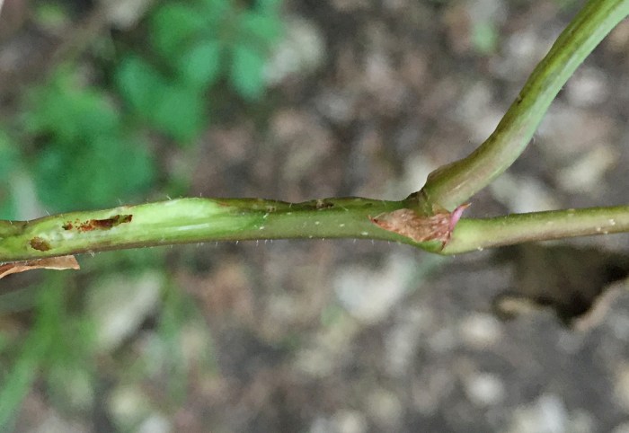 The first ready indicator of this internal feeder consists of subtle longitudinal swellings on petioles and new stems of the host, which appear in late May and early June. The galls stretch along the length of the petiole or stem and may extend partway around the circumference of these plant parts, but in most examples I saw in 2023, there remained at least one unaffected strip of tissue along the length of the plant part.