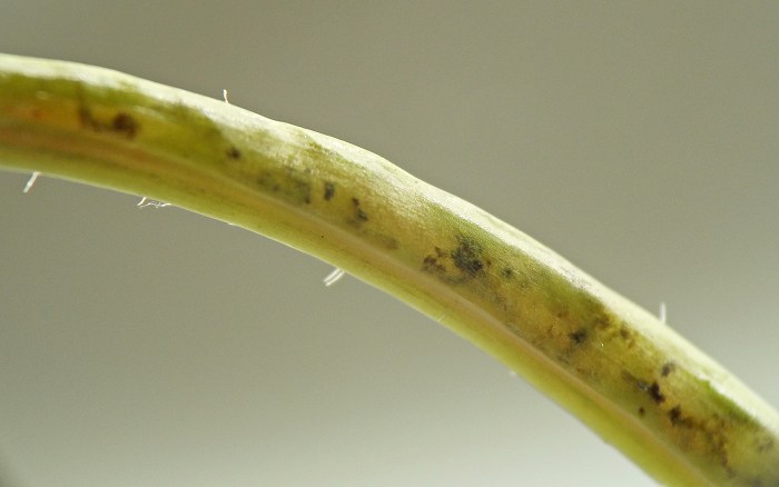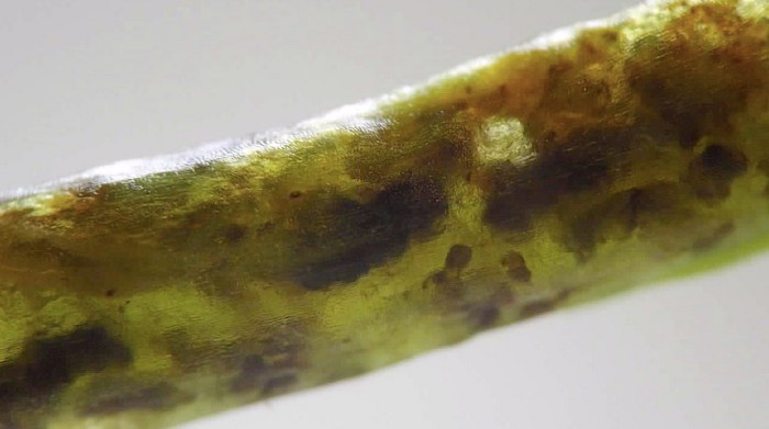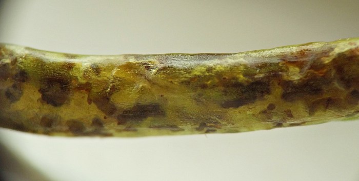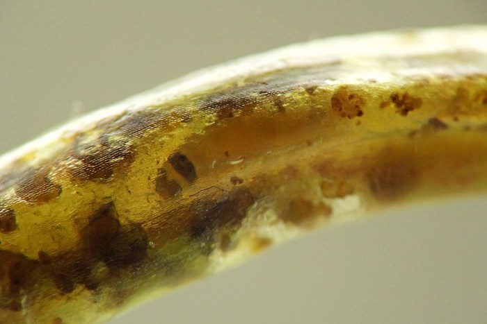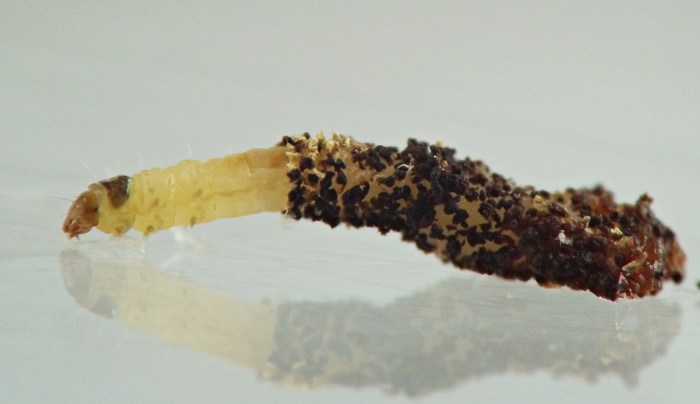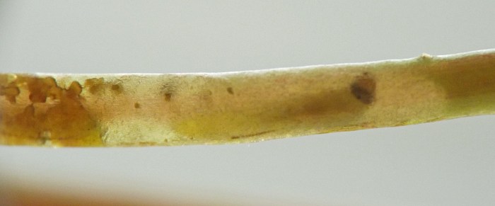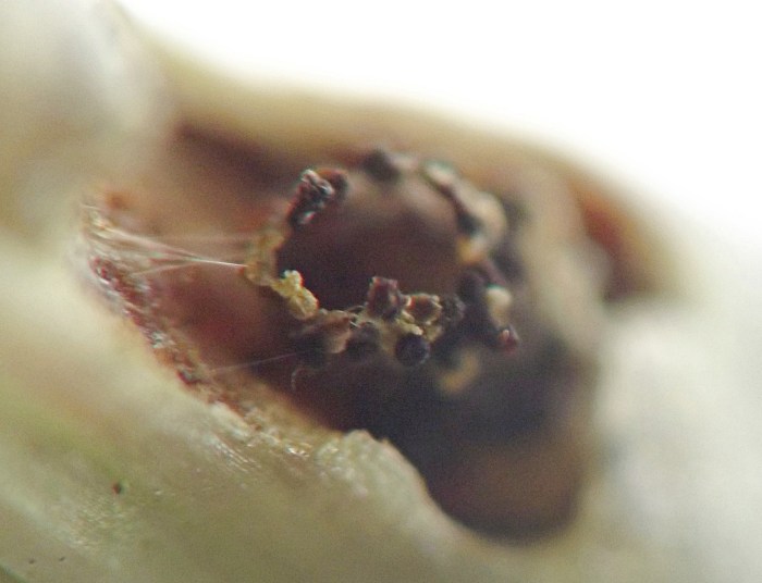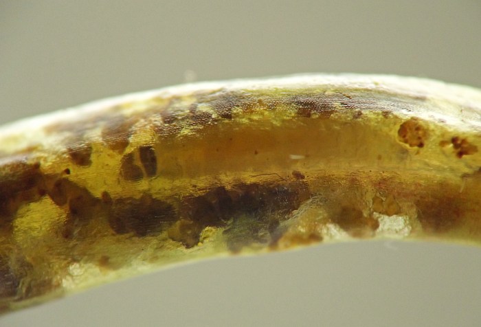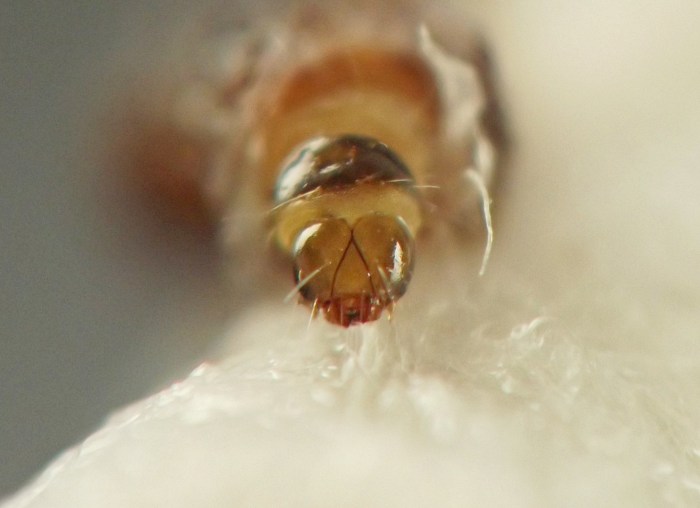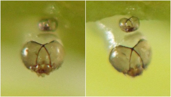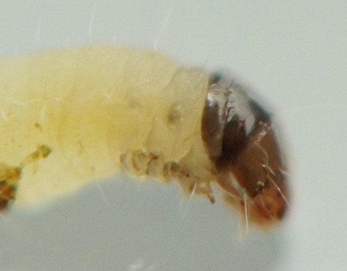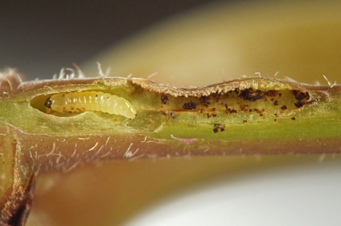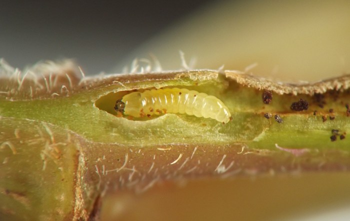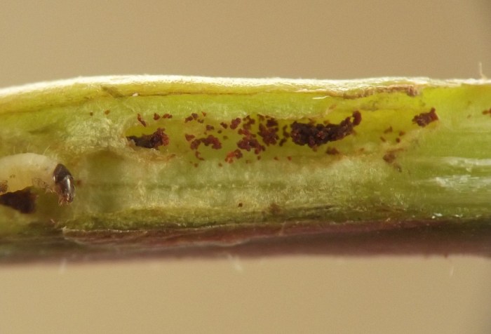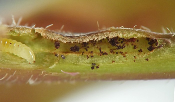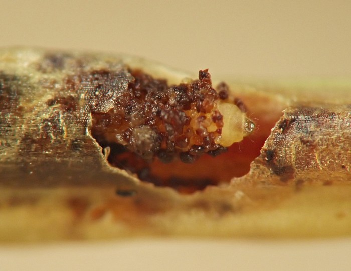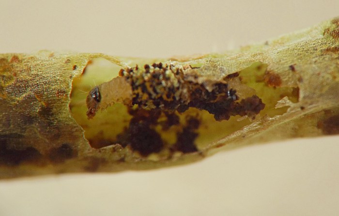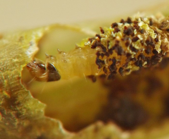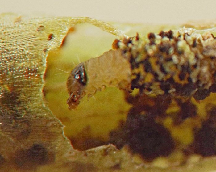 Larvae kept in containers indoors developed quickly, excavating extensive tunnel systems in the galls. Eventually only the second, larger larval form could be found in the plant material. The tunneling soon destroyed most of the tissue in the swollen portions of the petioles and stems, causing the galls to darken due to the internal accumulation of dark brown frass visible through the plant epidermis. Larvae could also be observed through the plant epidermis as they adjusted position, fed, and defecated. I watched larvae interact with one another inside the tunnels and engage in housekeeping by moving particles of frass around with their mandibles.