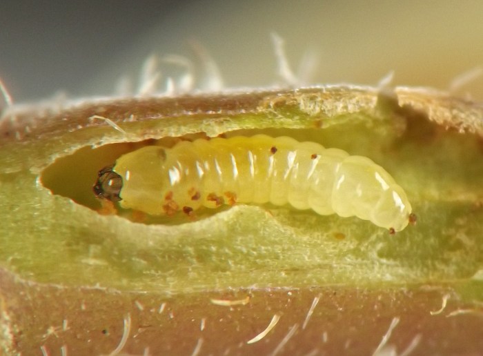 A gall dissected on 24 May 2022 contained no visible larvae -- perhaps because eggs laid in the tissue had not yet hatched. In 2023, starting on June 3, dissecting some of these galls revealed lepidopteran larvae tunneling inside them and producing reddish-brown solid frass in the tunnels. At that time two different forms of larvae could be found in the galls, a smaller form with a dark head capsule but without obvious thoracic legs, and a slightly larger form with a dark head capsule, a dark thoracic shield, and well-developed thoracic legs. McGiffen and Neunzig reported that "larvae of an unidentified weevil" were mixed in with the Heliozela larvae in the petiole, peduncle, and/or shoot galls they examined, and stated that "[the] weevil larvae can be distinguished from Heliozela larvae by the weevils' lack of thoracic legs and crochets" (p. 52). I did not observe any larvae that clearly belonged to Coleoptera in the galls I examined, and my strong impression was that the smaller, apparently legless larvae and the larger larvae with thoracic legs from these galls represented different instars of the same species, with the apparently legless form being an earlier instar, suggesting some form of advanced metamorphosis occurs from the legless to the legged instar.