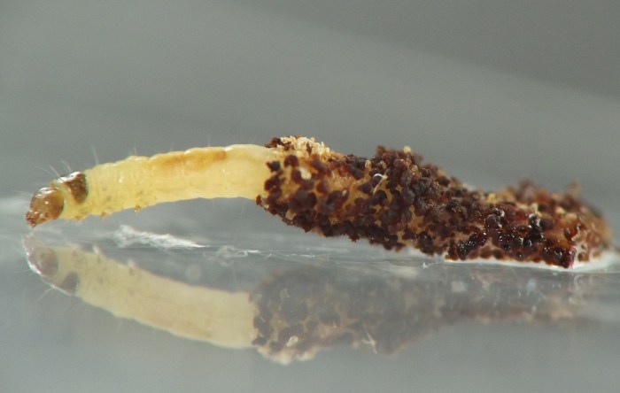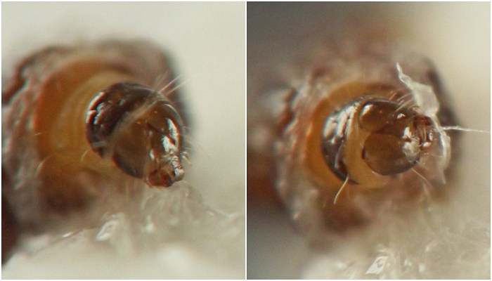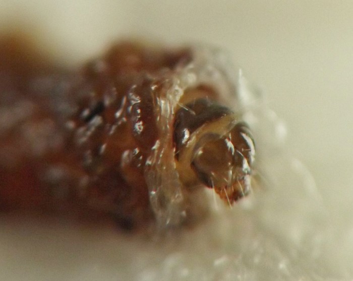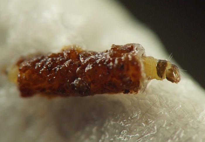Prior authors have indicated or implied that this interwoven composite of frass and silk comprises the base layer of the case, and that the large holes in the plant epidermis occur due to the eventual disintegration of the injured plant tissue and are not directly related to case construction. For example, Weiss and West wrote that their larvae constructed for themselves "case(s) made from particles of excrement" and then exited the galls "through small openings which later become ragged tears due to the collapse of the tissue" (p. 117). Similarly, McGiffen and Neunzig reported that the larvae they observed built "tubes of frass" around themselves and that a "plug of gall tissue" was not present in the pupal case, unlike for H. aesella larvae from leaf galls with whom such a plug is present; in addition, "after larvae have exited, the thin layers of the gall crack open" (p. 52).