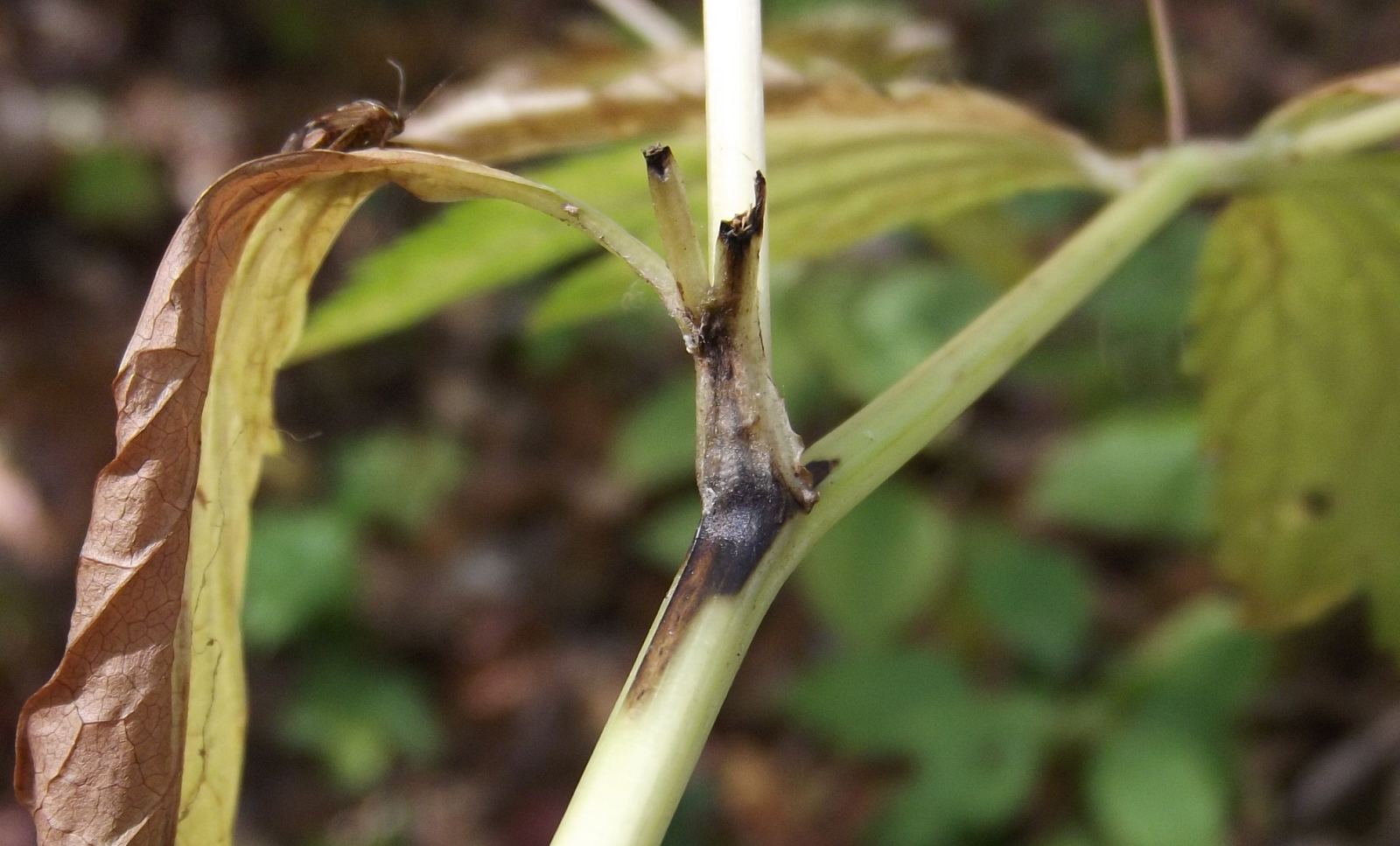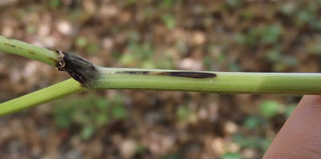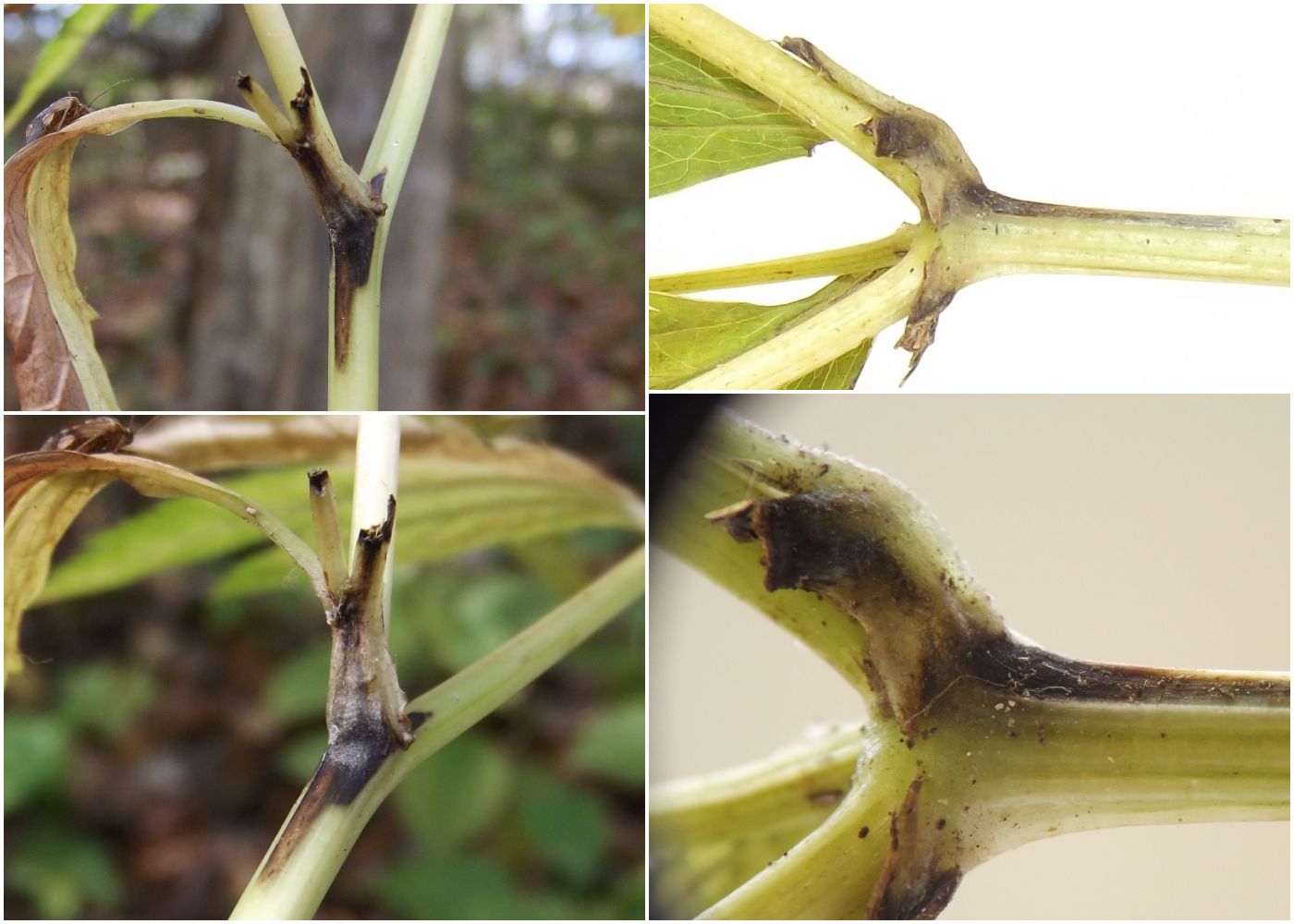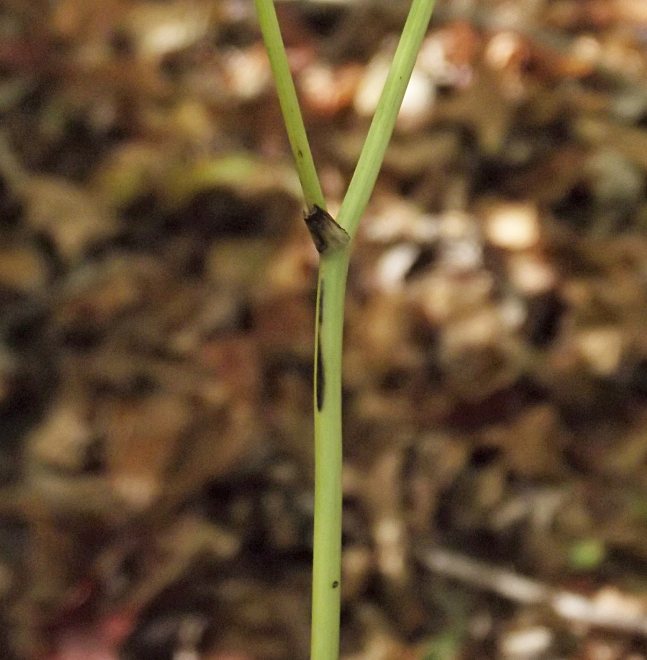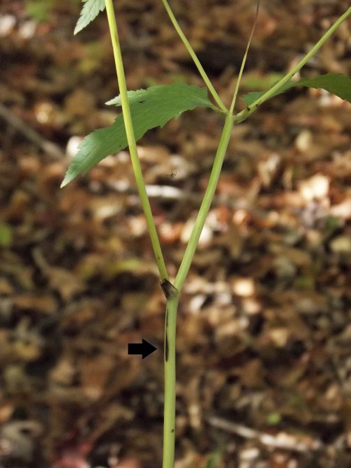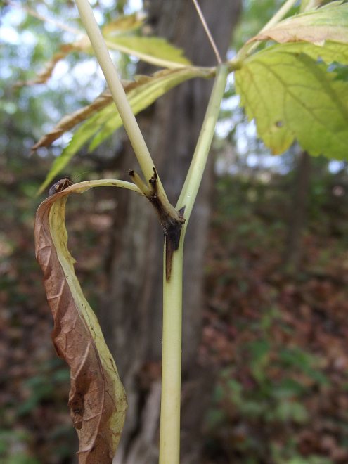 Finally, a further note on the plant damage wrought by this insect. In at least two of the affected stems I observed in autumn, the inhabited blackened region on the stem appeared to extend as a black line into the petiolule of one of the three leaflets of the adjacent, compound stem leaf (images 491-33 and 491-34), and this petiolule had broken so that the blade of the leaflet was missing. I hypothesized that the blackened region's extension into the petiolule had weakened the petiolule and thus eventually caused it to break, but I was unable to confirm this. Also in autumn, I found a Sanicula basal leaf with a blackened mine traveling from the leaf blade into the petiole, and the part of the mine in the petiole resembled the blackened regions in the autumn stems. I have placed this leaf mine observation in another record (0489) since the culprit was absent from the mine and I know of no records of cecidomyiids mining in leaf blades. However, the mine did share some similarities with the petiolule-to-stem blackened regions in the autumn stems, and, when combined with the minelike traces in the summer stems, it is tempting to speculate that the Neolasioptera may sometimes migrate from a leaflet into the main stem or petiole, or just for some distance along the main stem, in a manner similar to mining, but further study is needed. (Leaf terminology based on Master Gardeners of Northern Virginia 2026.)
