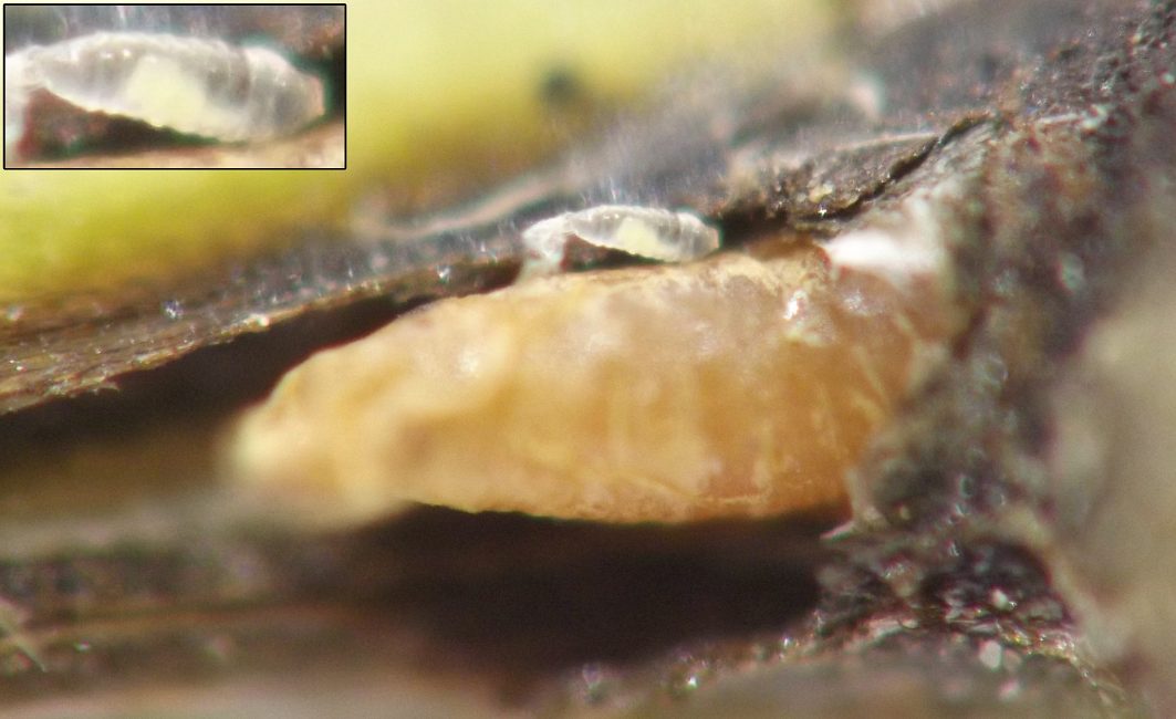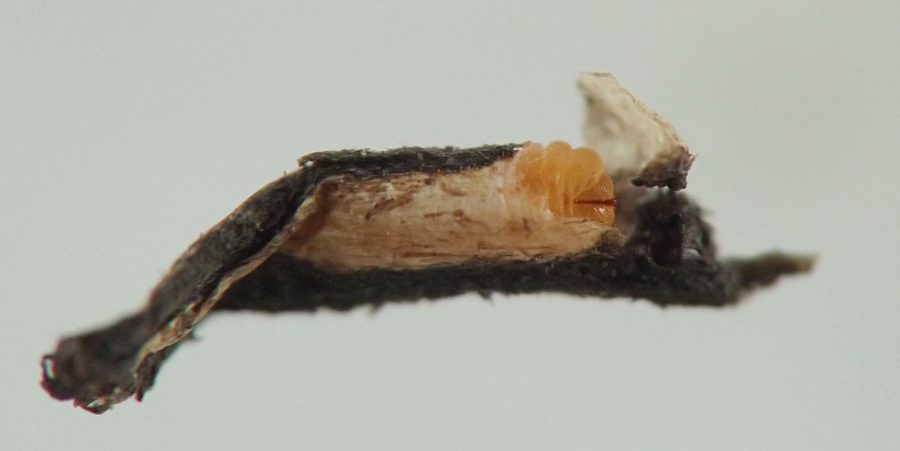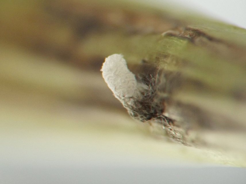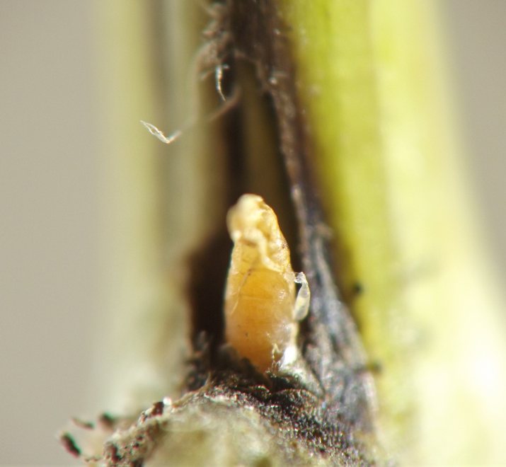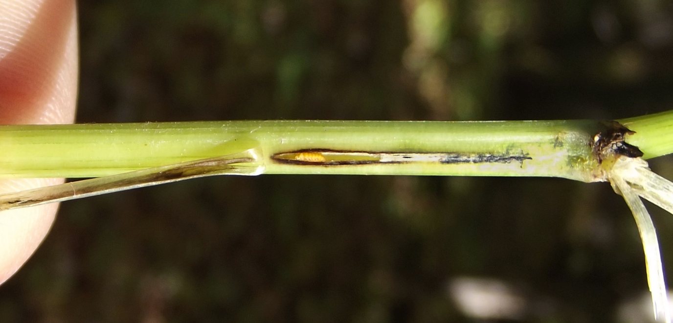The autumn observations of inhabited stems, from late September and early October, involved several plants that each featured a short, linear, blackened area on the main stem just below the lowest branching point of the inflorescence (images 491-01 through 491-06 and 491-30 through 491-32). Each blackened region hosted a single larva in a chamber just under the outermost layers of stem tissue, the chamber elongated into a tunnel several centimeters in length in at least one instance (images 491-01 through 491-04). One larva I examined had a very tiny ectoparasitoid larva attached to it (image 491-32).