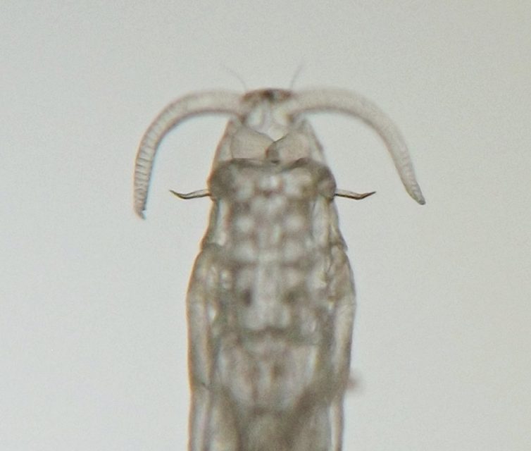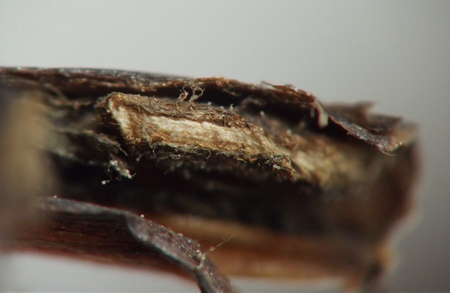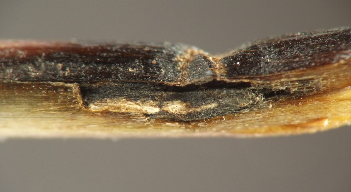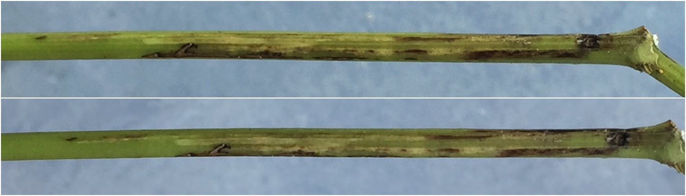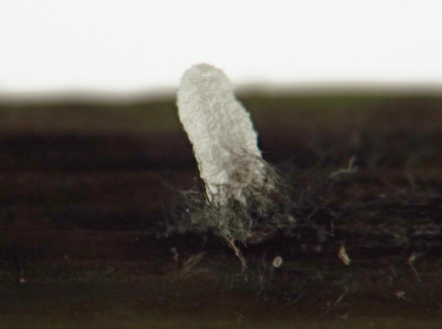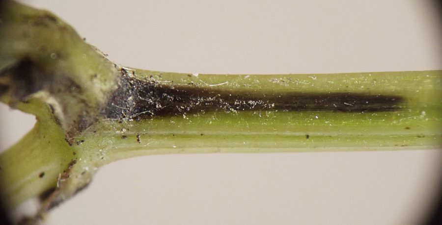 The autumn observations of inhabited stems, from late September and early October, involved several plants that each featured a short, linear, blackened area on the main stem just below the lowest branching point of the inflorescence (images 491-01 through 491-06 and 491-30 through 491-32). Each blackened region hosted a single larva in a chamber just under the outermost layers of stem tissue, the chamber elongated into a tunnel several centimeters in length in at least one instance (images 491-01 through 491-04). One larva I examined had a very tiny ectoparasitoid larva attached to it (image 491-32).