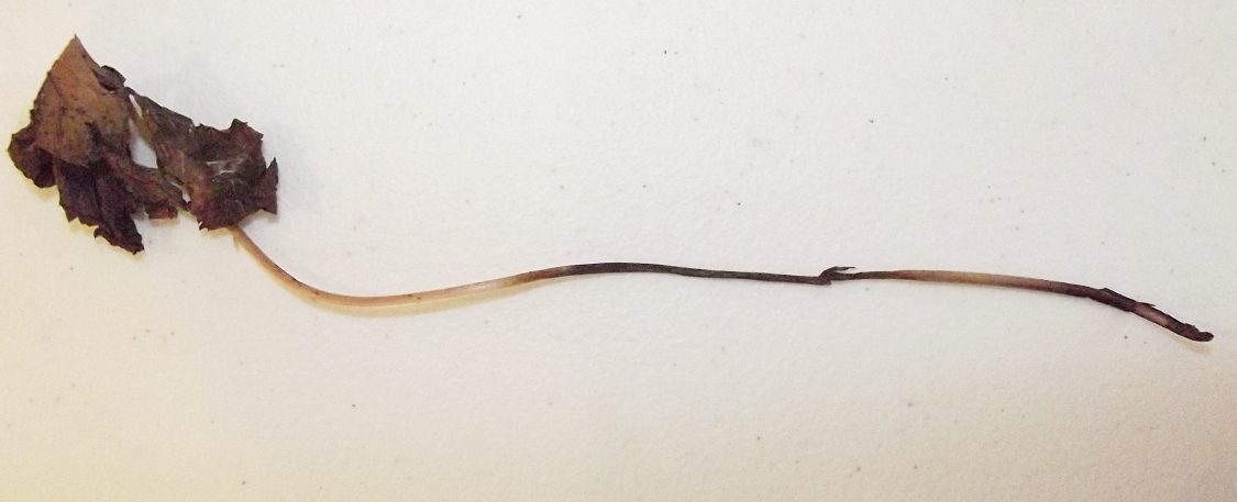 I also located inhabited basal leaf petioles in autumn. In one of these observations (images 491-26 through 491-29), the inhabited portion of the petiole was externally and internally blackened, with multiple orange larvae in whitish cocoons inside. At least one of the cocoons was mostly covered in an unidentified black material, probably hyphae of a symbiotic fungus (image 491-28).