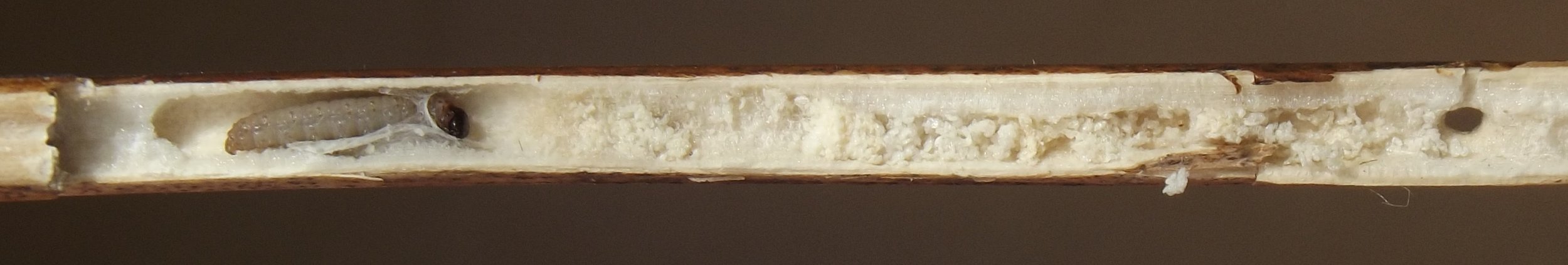 Coll. 01/01/17, photos on 02/05/17 (01-02, scraped stem entrance and larva in tunnel inside); coll. 10/18/16, photos same day (03-06, reddish-purple larvae in stems); coll. as larva in stem on 02/05/16, em. 05/24/16 (07-09, adult and pupal exuviae); field photos on 04/10/16 (10-12, bird-attacked stems in the field); coll. winter ?2016, photo on 07/27/22 (13, bird-attacked stem); coll. 08/23/21, field photo same day (18, fruit), additional photos 08/26/21 (14-16, tunneled fruit w/ larva); field photo on 09/29/23 (17, heavily tunneled stem with extensive frass accumulation on exterior).