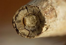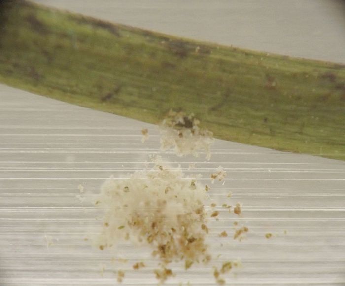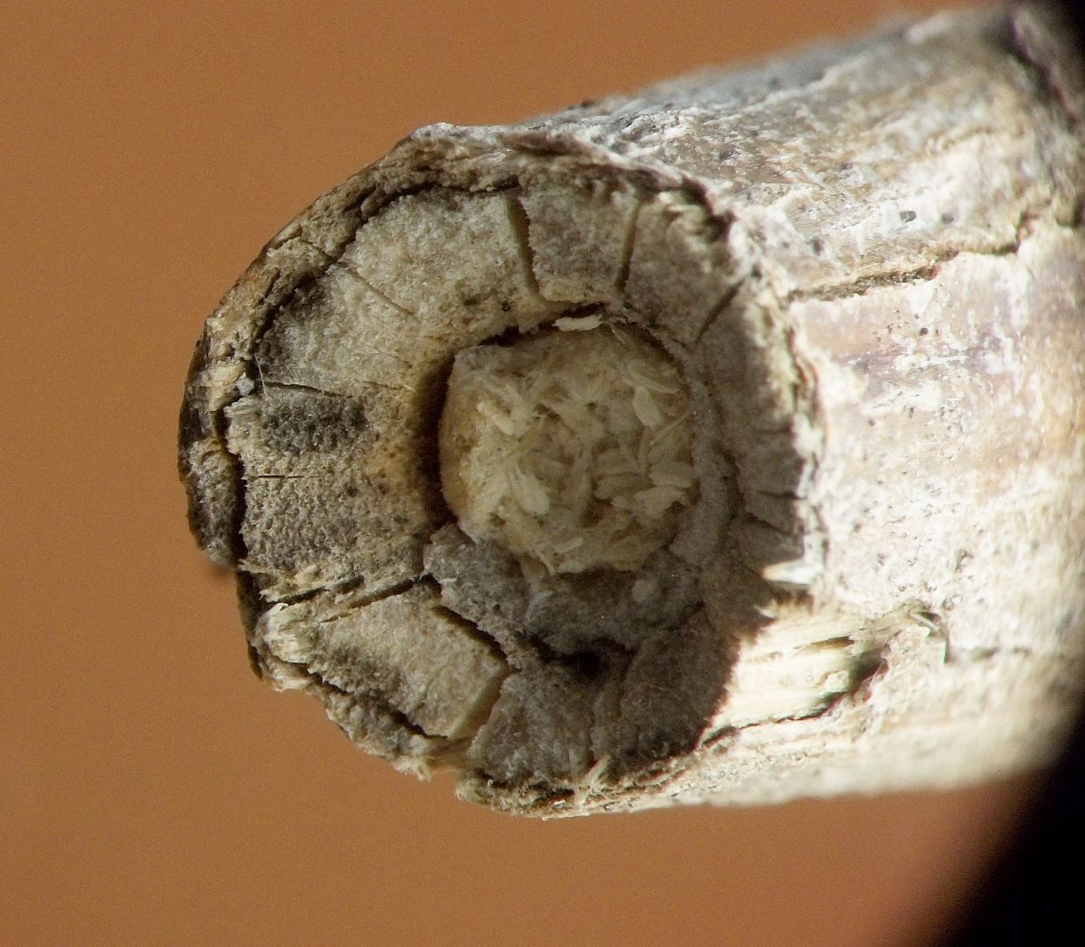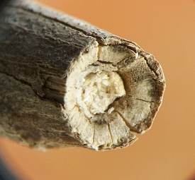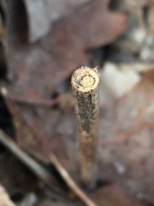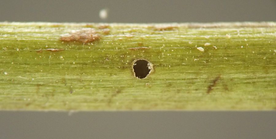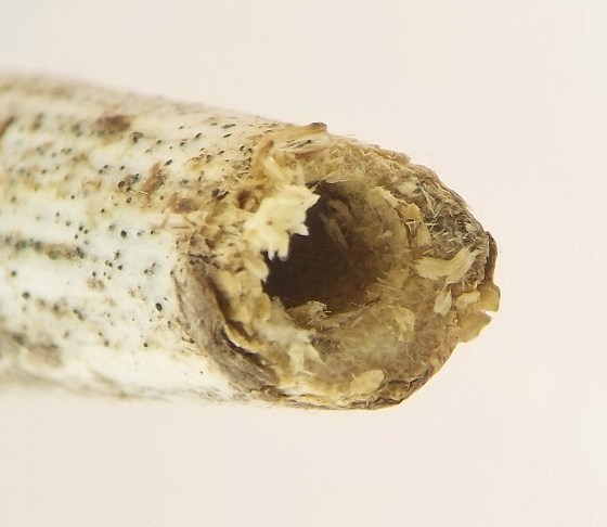 In August 2023, I observed a young Hellinsia larva in a stem of elmleaf goldenrod, S. ulmifolia. The larva dwelled in its gallery in the pith of the lower stem and expelled frass through a small round hole in the outer wall of the stem. I am unsure if this S. ulmifolia feeder is the same species as the one described above from stems of S. canadensis complex.