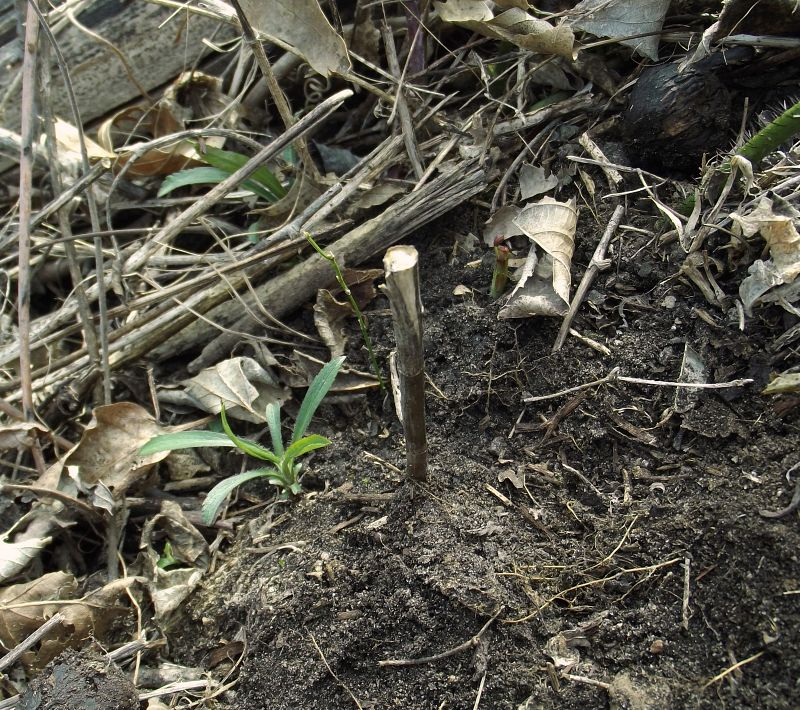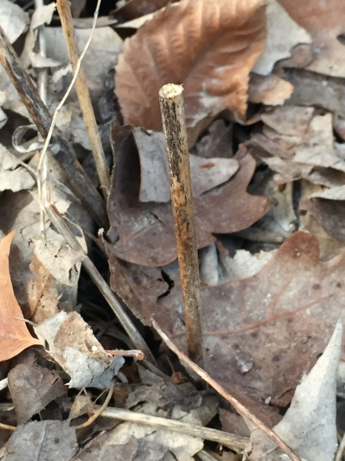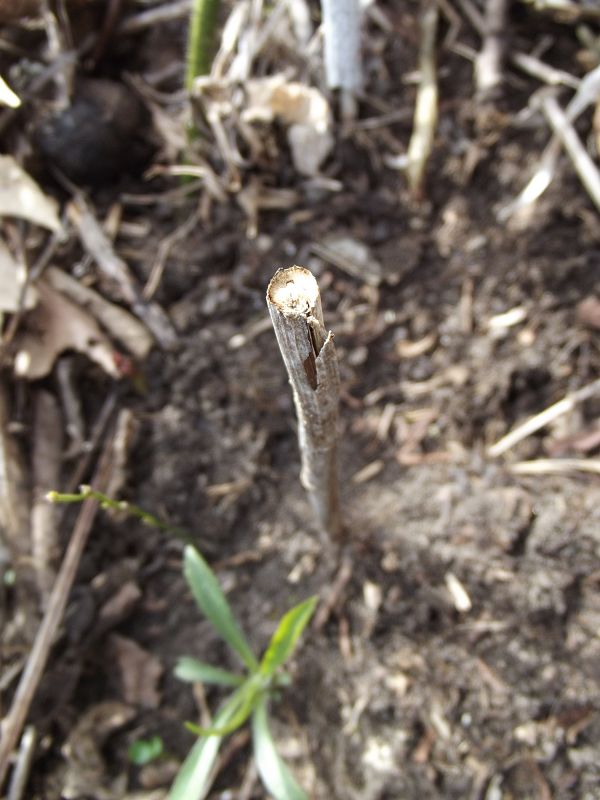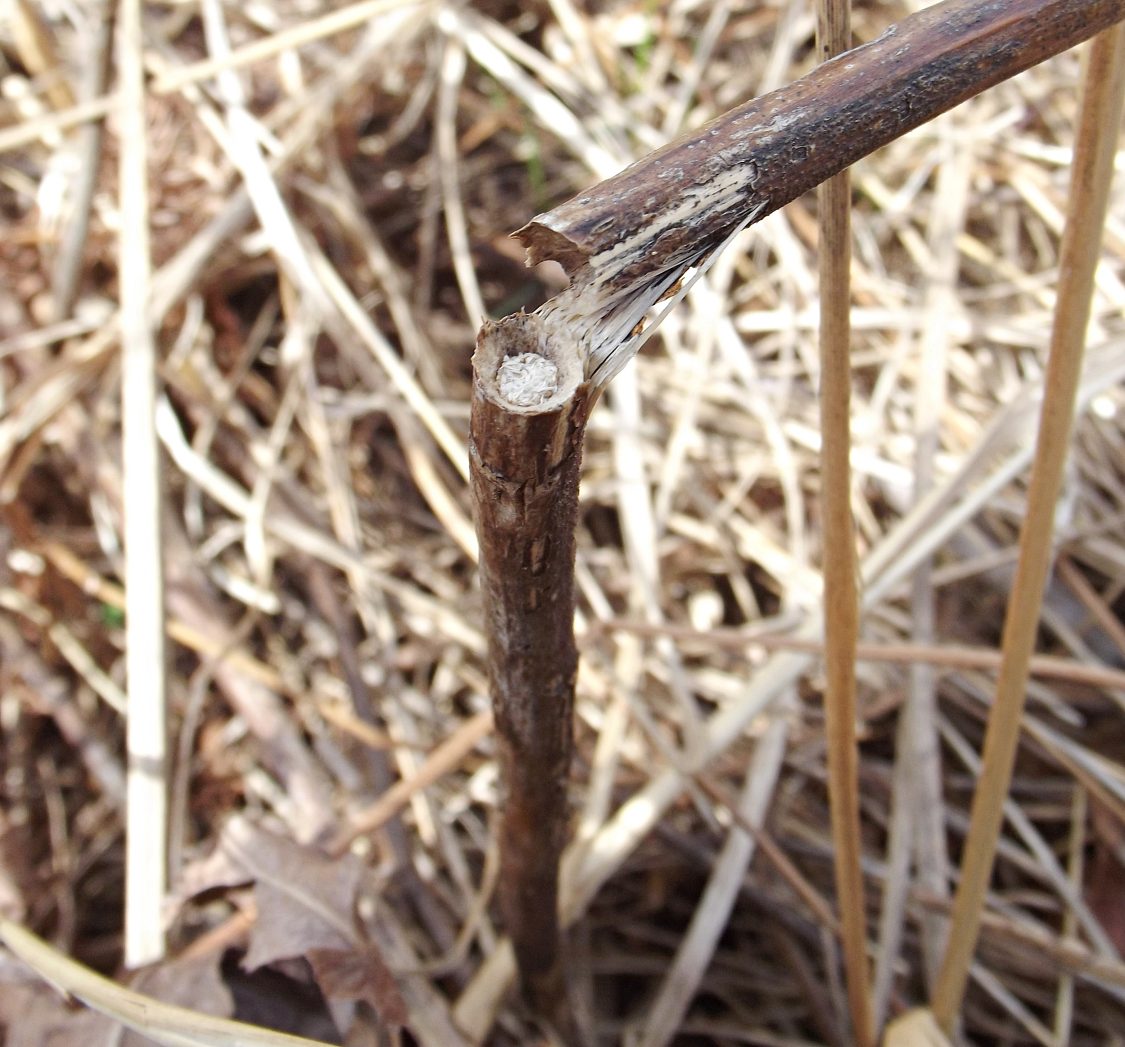 In Solidago cf. canadensis, the larva tunnels in the lower stem and, when at or near maturity, severs the stem ~10-35 cm above ground level, causing the upper part of the plant to break off and leaving a lower stem "stump" with the larva inside. My observations show that the outer walls of the stem at the tip of the stump sometimes have a beveled edge, having been cut by the larva at an angle (see photos). After making the cut and allowing the top of the stem to break off, the larva seals the open end of the stump with a plug of frass. Larvae overwinter in stem stumps at ground level. In spring, prior to pupation, a larva I kept in its stem stump in a rearing container removed the frass plug from the stump, making way for the eventual emergence of the adult moth. I reared two adults in May 2017, and one of these was identified as H. glenni by D. Matthews from photos.