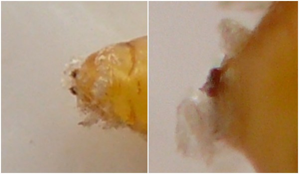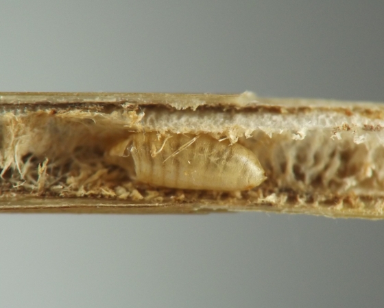 In October 2021 I collected a stem of Solidago flexicaulis that was being mined by an Ophiomyia stem miner agromyzid. Later, an Ophiomyia adult and a Melanagromyza adult emerged from the stem, and when I dissected the stem interior I found a spent puparium in a tunnel in the pith (images 519-07 and 519-08).