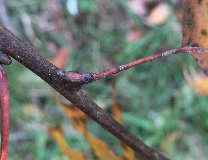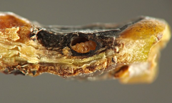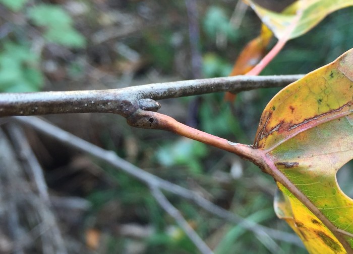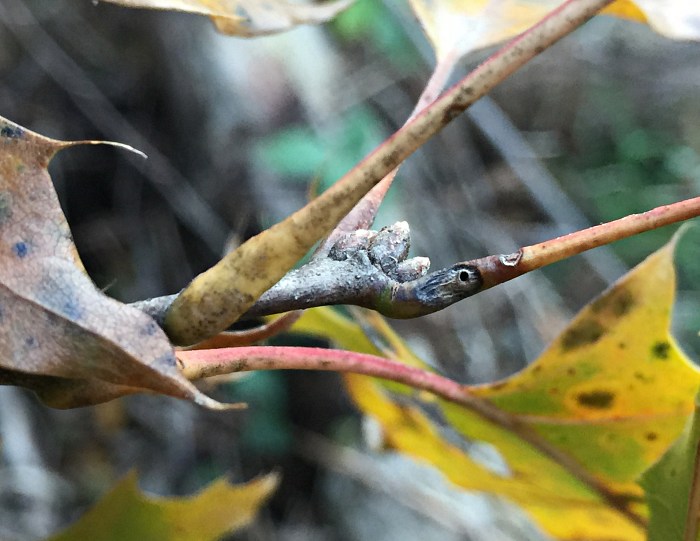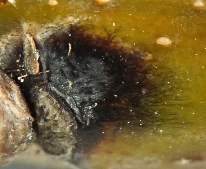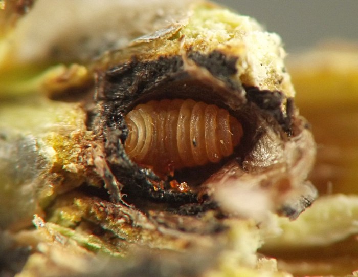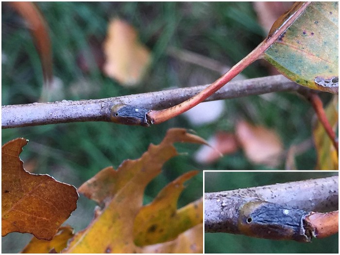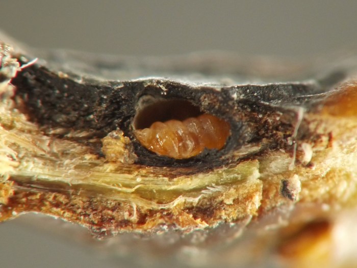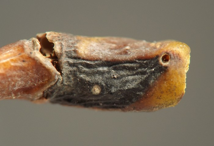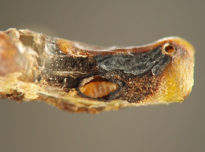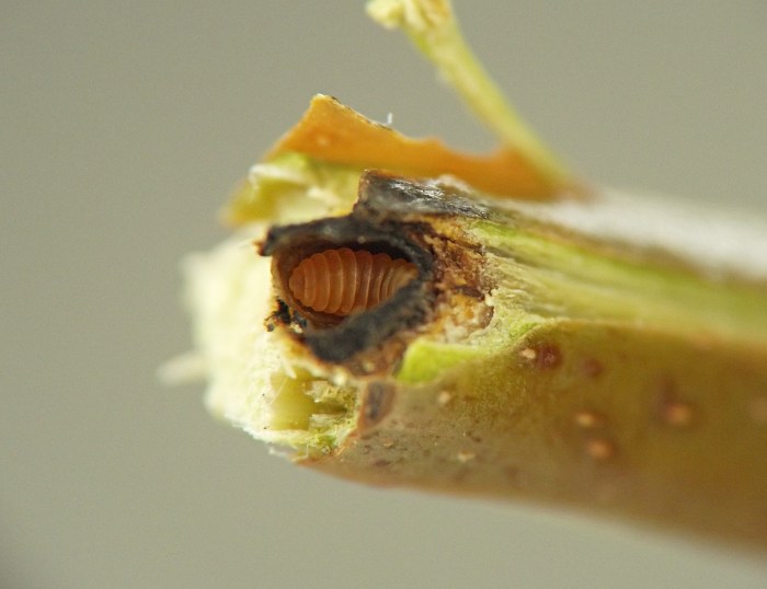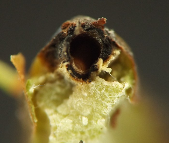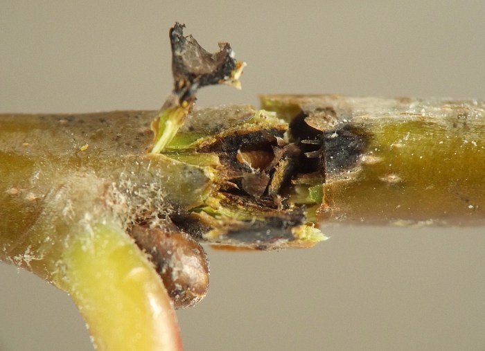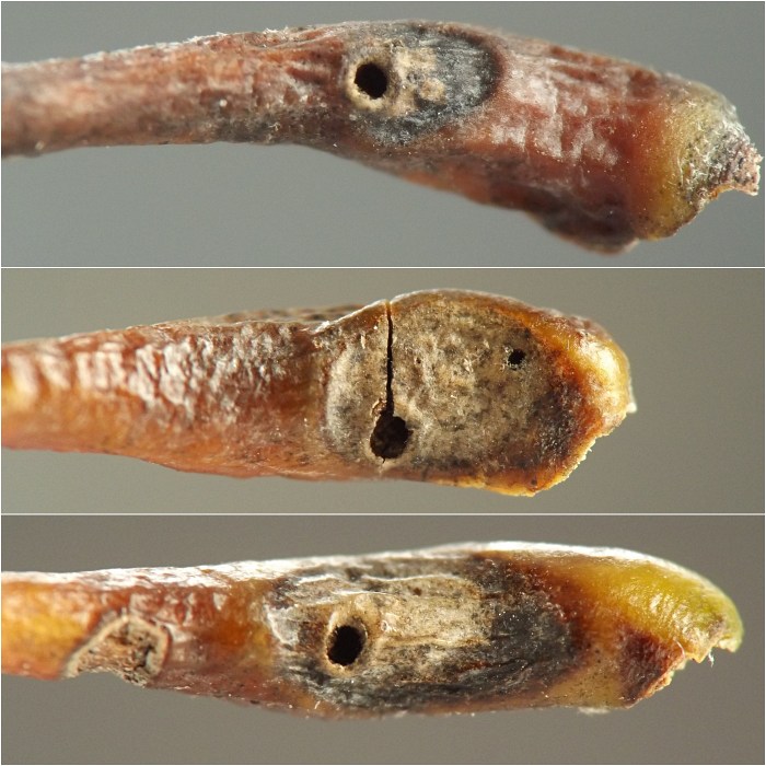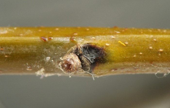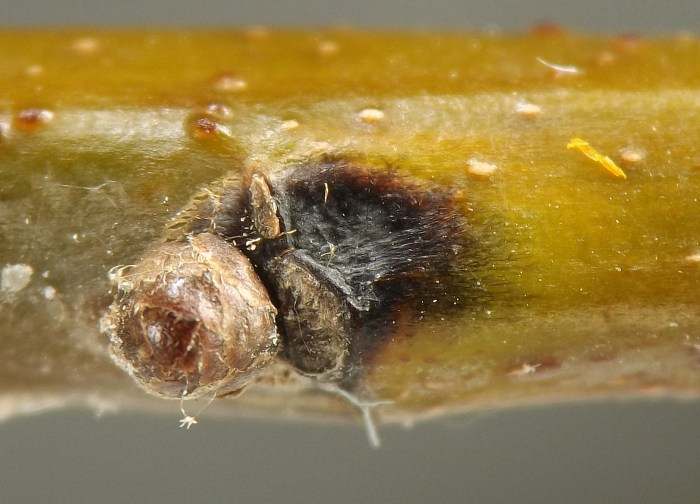 Larvae were found singly in smooth-walled, ovoid chambers beneath sunken and blackened areas in the bases of leaf petioles or in first-year twigs of the host. The blackening appears to be the result of a fungus, presumably an intentional associate of the gall midge, affecting the plant tissue. The base of one petiole examined by the author contained four larval chambers, three of which had already been evacuated and one of which still contained a larva when the plant material was collected in late October. Other petioles contained just one or two chambers each. Affected petioles no longer inhabited by this insect may show a small round exit hole within the sunken, blackened area, opening from the empty chamber beneath; it has not been determined if the exit hole is from the gall midge emerging or rather from one of its parasitoids emerging. Affected first-year twigs were found to be inhabited by larvae in late July. One example of a blackened, sunken area on a twig appeared to extend into the base of a leaf petiole, which made the author wonder if the petiole and stem feeders might belong to the same species. They are treated in a single account here, although it is unknown how many cecidomyiid species are involved. The typical overwintering stage and location is unknown.