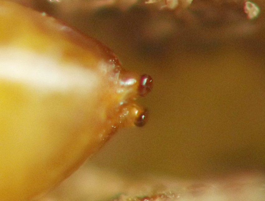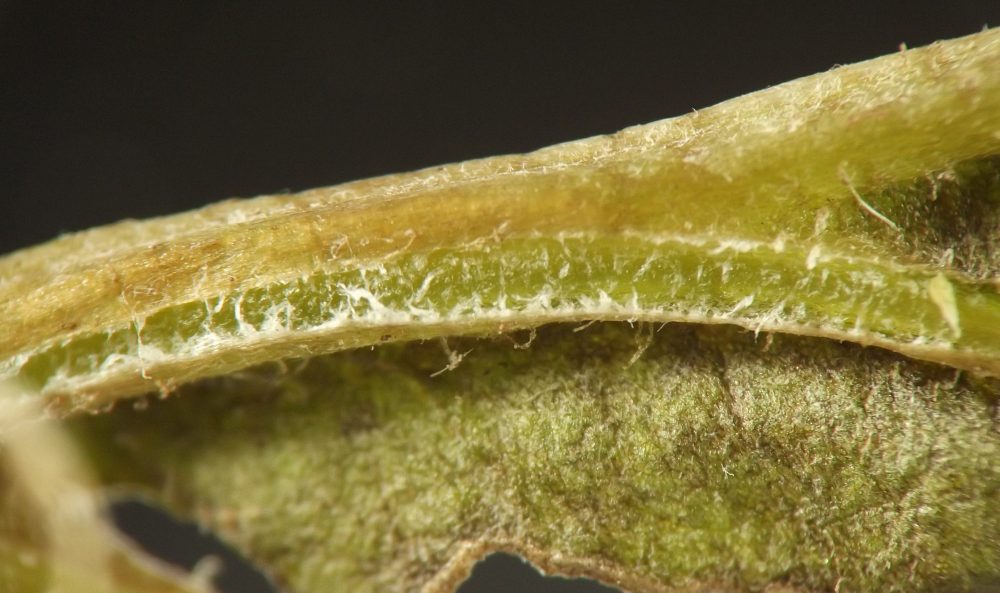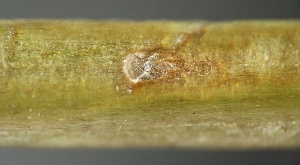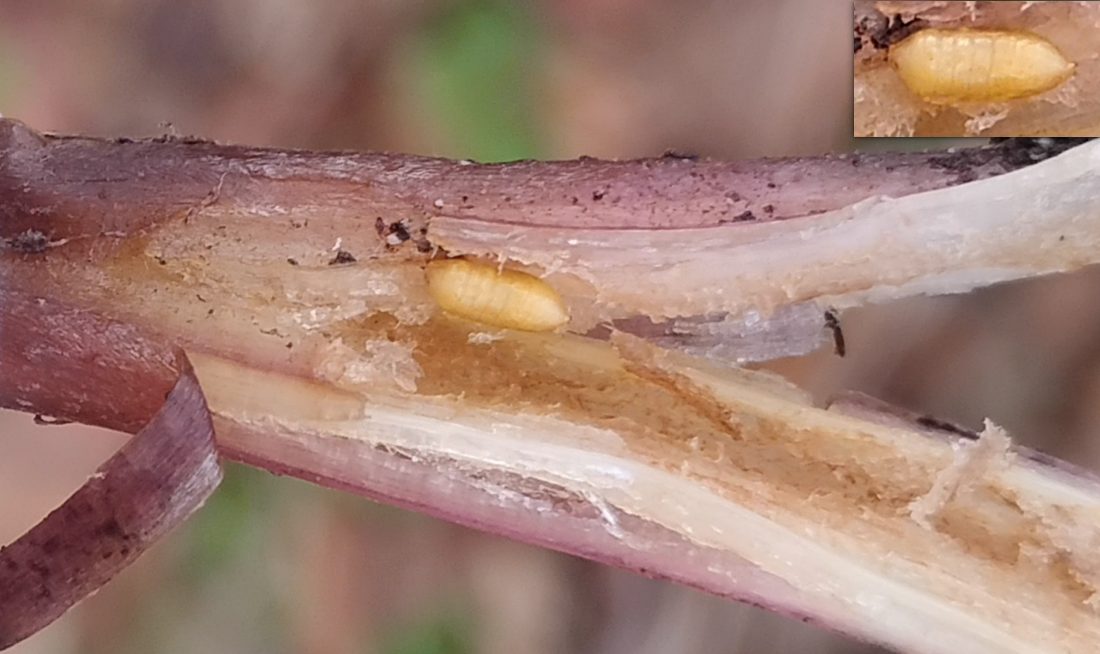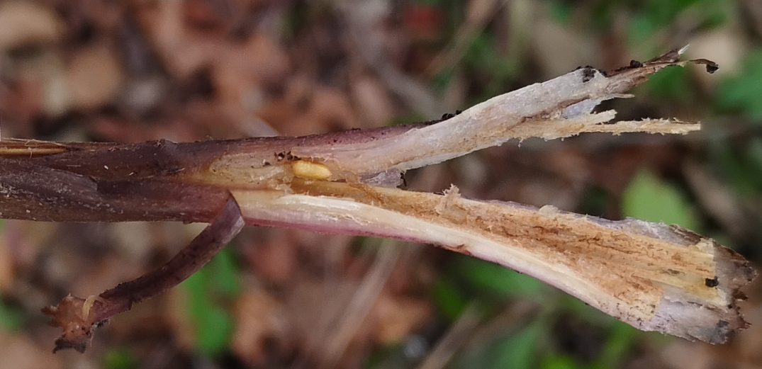 In the 2021 findings I observed the placement of the puparia within the petioles. In each case the puparium was formed in a tunnel that led from the petiole interior to the surface tissues, with the puparium positioned just behind a roughly circular, transparent operculum of petiole epidermis that sealed off the end of the tunnel from the outside world.
