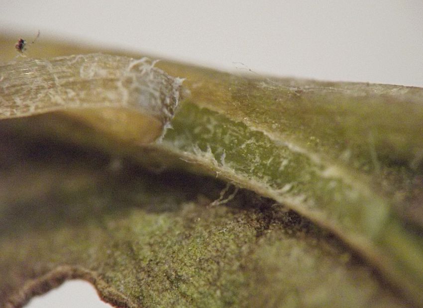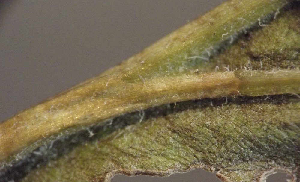 Tunnels of this agromyzid occur in basal leaf petioles of the host. In one example observed, the tunnel system wound through much of the length of the petiole and even extended into some of the major veins of the leaf. The tunnel walls showed a ragged texture.