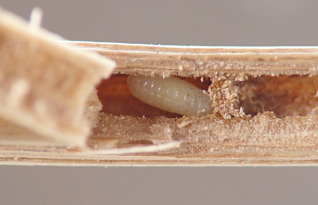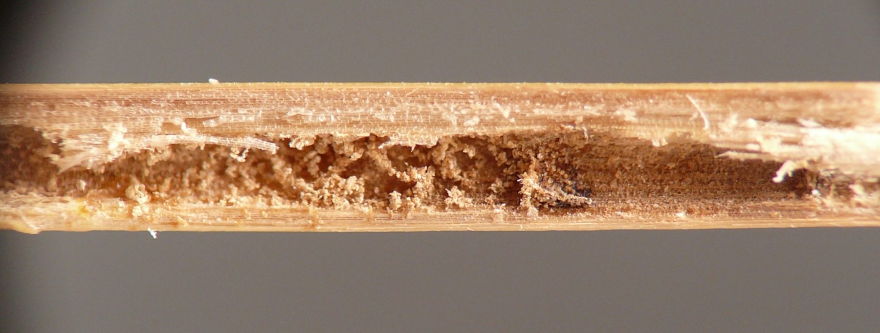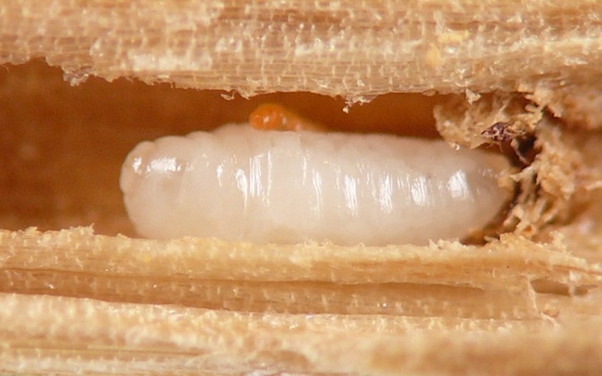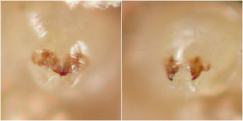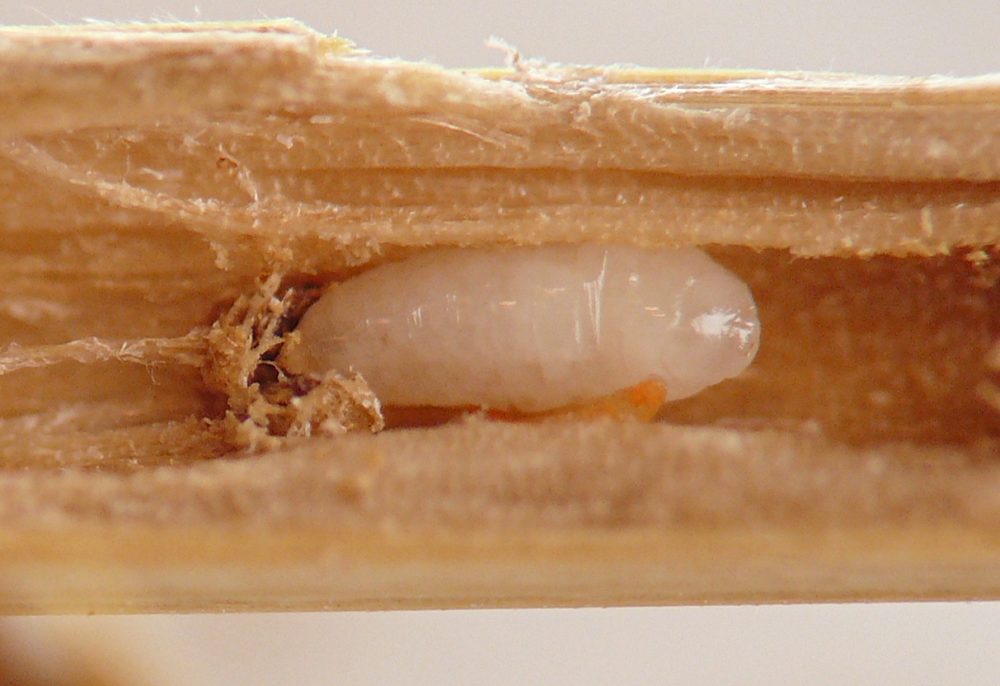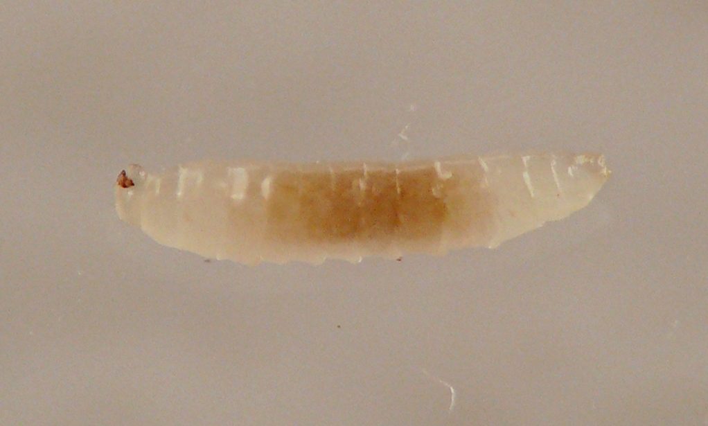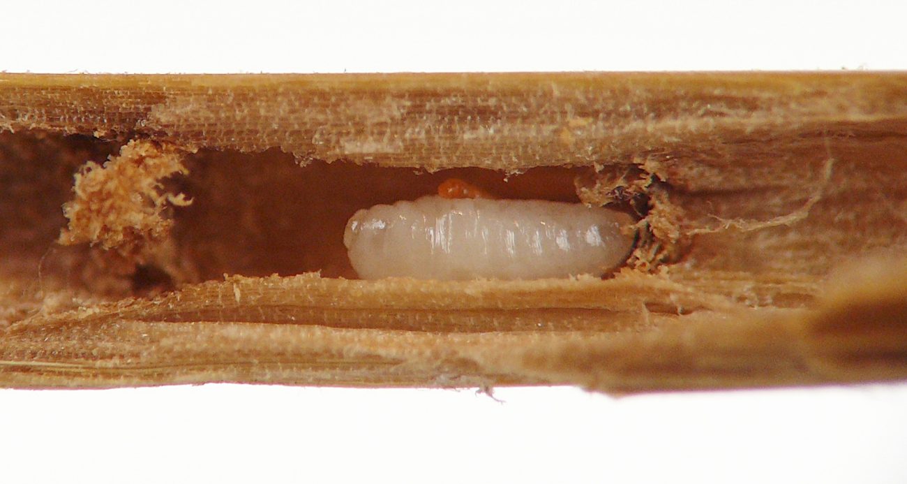 I located several larvae (tentatively identified as Eurytomidae based on habitat and close resemblance to confirmed eurytomids from stems of other hosts examined in the survey) in culms of orchard grass in late September. At least three of them were squat and rotund with a small, round, poorly differentiated head and paired, sharp, needle-like mandibles. These larvae dwelled in short chambers partly separated from the rest of the culm interior by partitions apparently composed of frass. A fourth larva was more slender and narrow and I found it in a portion of culm roughly 10-20 mm in length that contained coarse grains of dry frass.