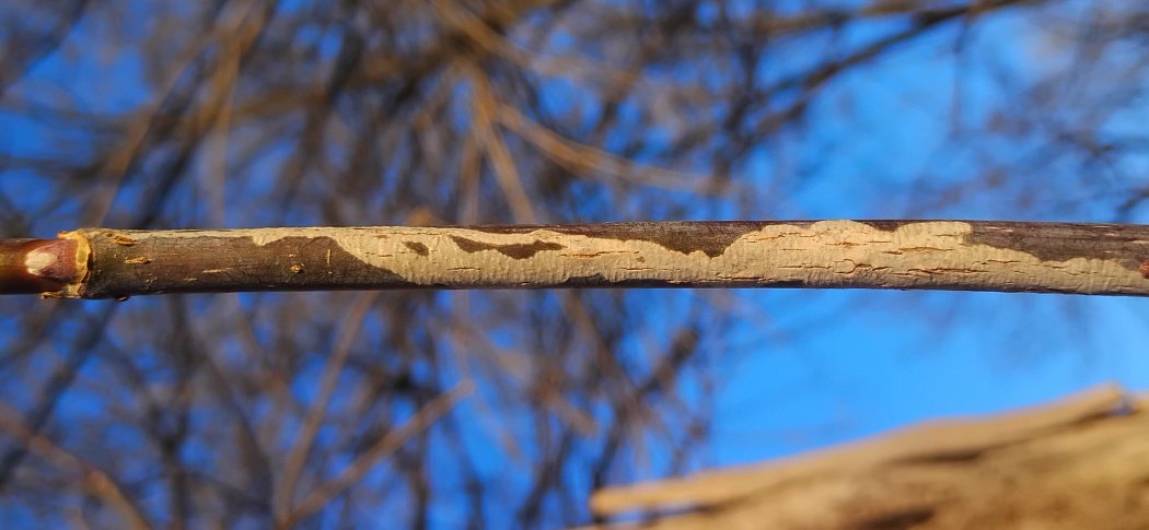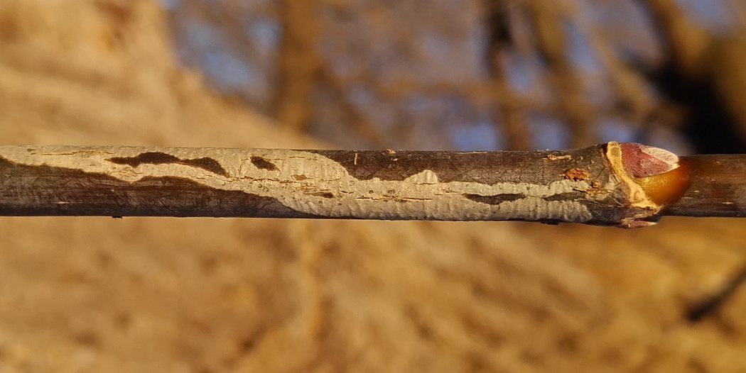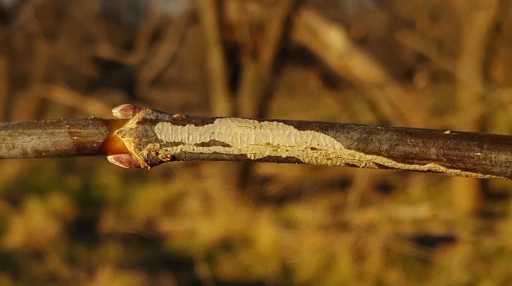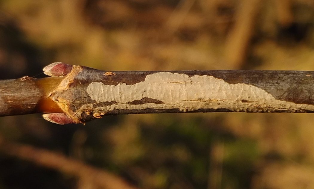 In 2026, I found a Marmara mine on a young boxelder twig in the winter, after it had already apparently been evacuated by the larva in the previous growing season. The mine was at least a decimeter in total length and widened considerably along its length as it wound up and down the twig. It was white in color compared to the darker color of the unaffected bark. The twig was a vigorous sprout from the main trunk of the tree, about six feet above ground level.