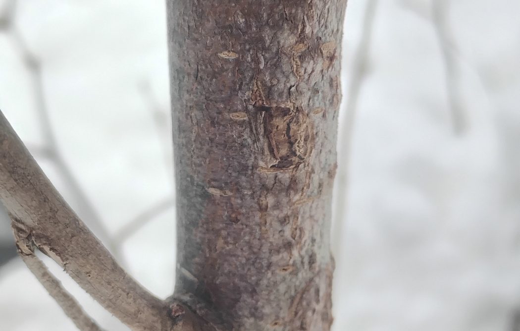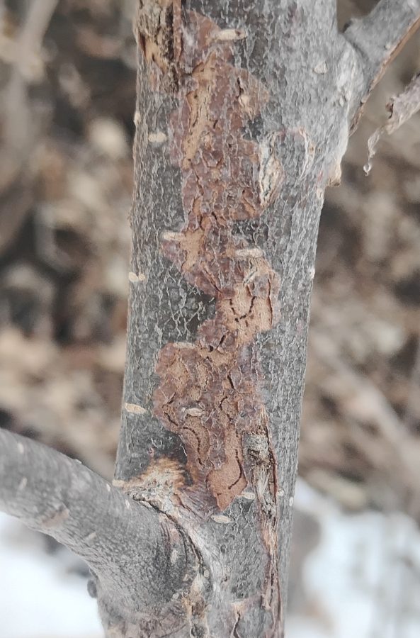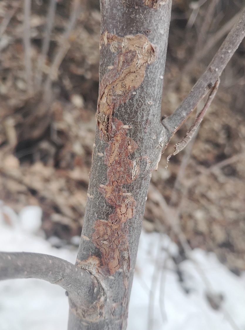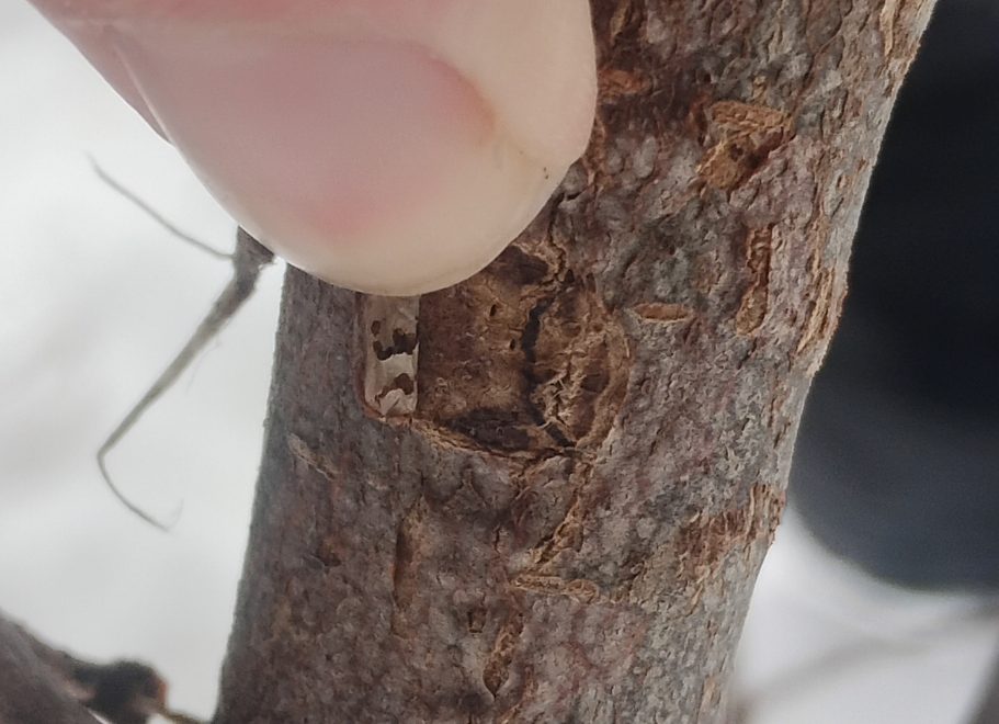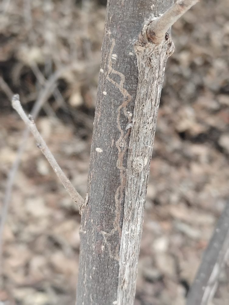 I encountered multiple bark mines of this moth on elm saplings in winter 2025-2026. Early mines made by young larvae were narrow and white, while older mines were broad and reddish, with areas where the outer bark had split or flaked off, revealing a tan-colored layer of stem tissue underneath on which the mine's black, broken central frass line could be seen.
