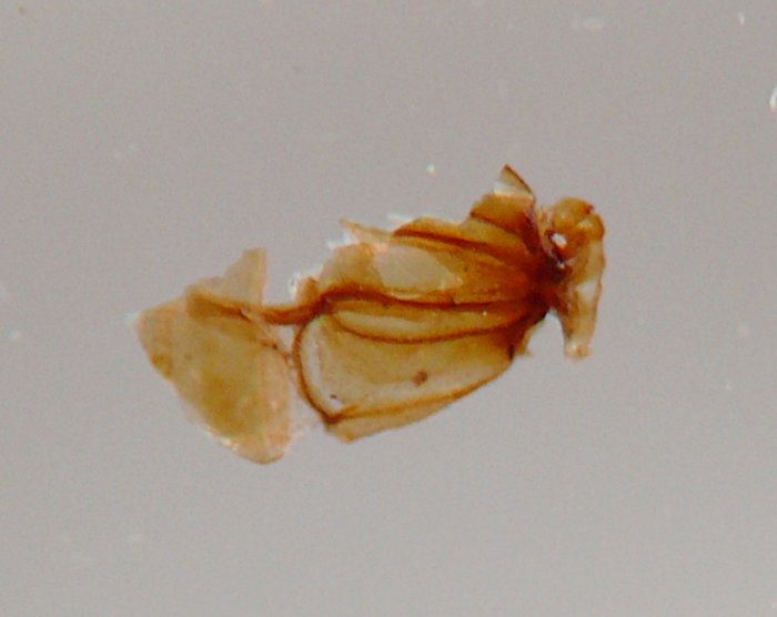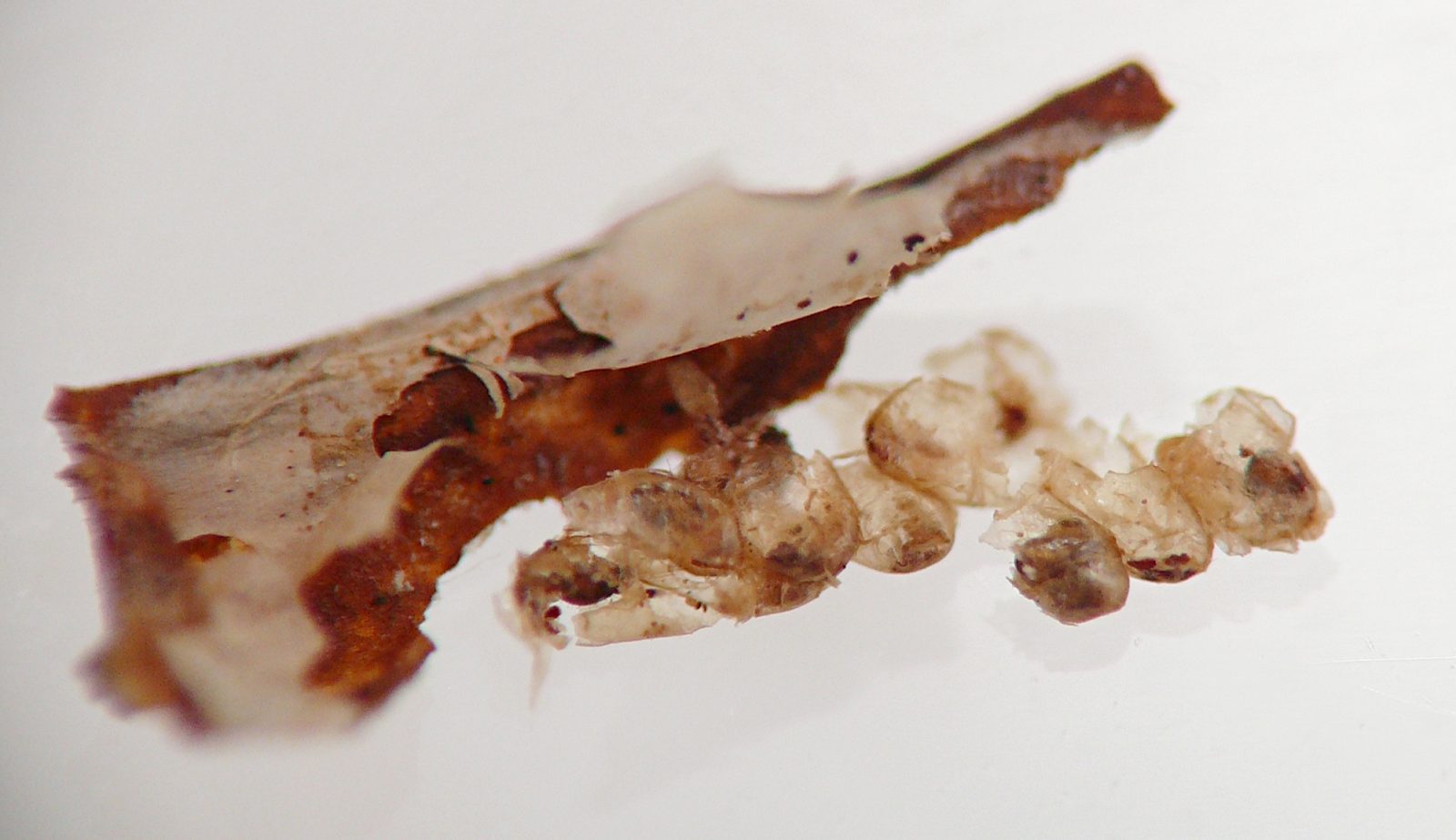In at least one example, I located the bark flap. The larva had constructed it at the terminus of the bark mine, approximately 115 cm above ground level. The whitish, finely woven cocoon was positioned inside the bark flap, with two to four round parasitoid exit holes perforating it. Inside the cocoon I found approximately seven translucent, membranous, pill-shaped parasitoid cocoons, most broken into pieces, along with a portion of the head capsule of the Marmara larva. Eiseman et al. (2017) reported that some single cocoons of Marmara viburnella in their Massachusetts rearing study produced multiple adult parasitoid wasps, such as Quadrastichus (Eulophidae) or Ageniaspis (Encyrtidae).