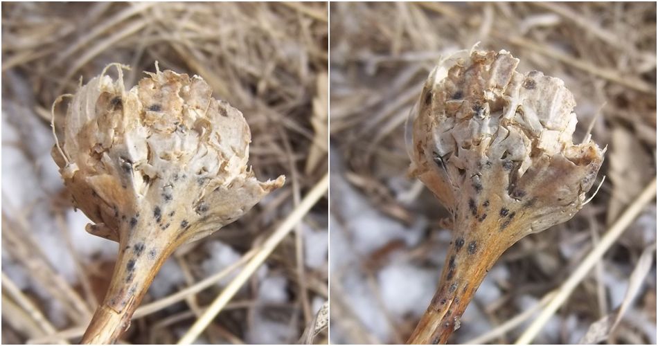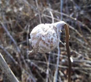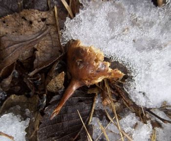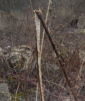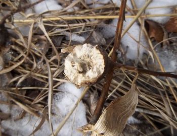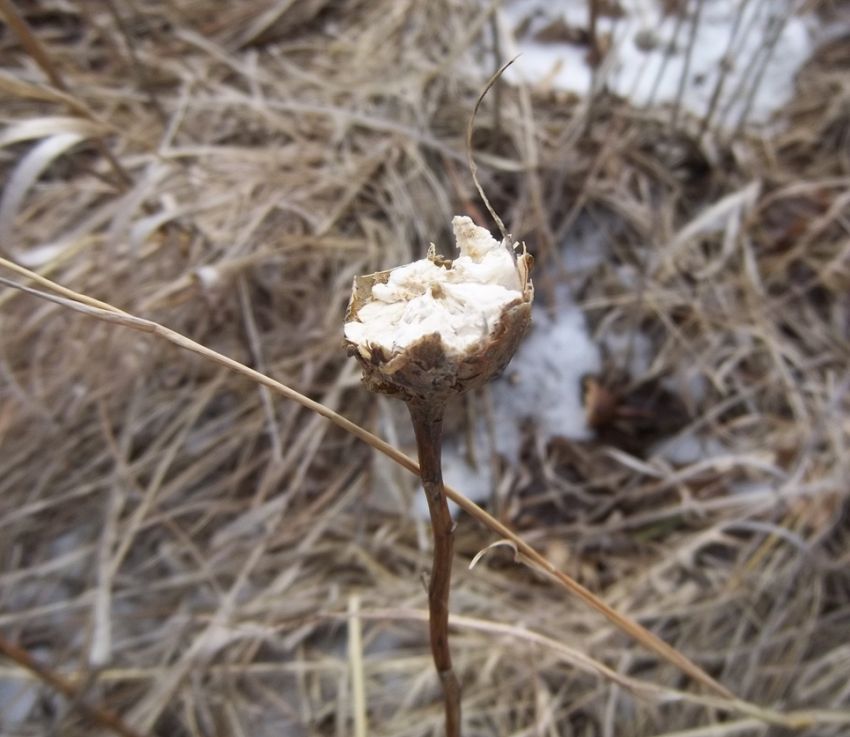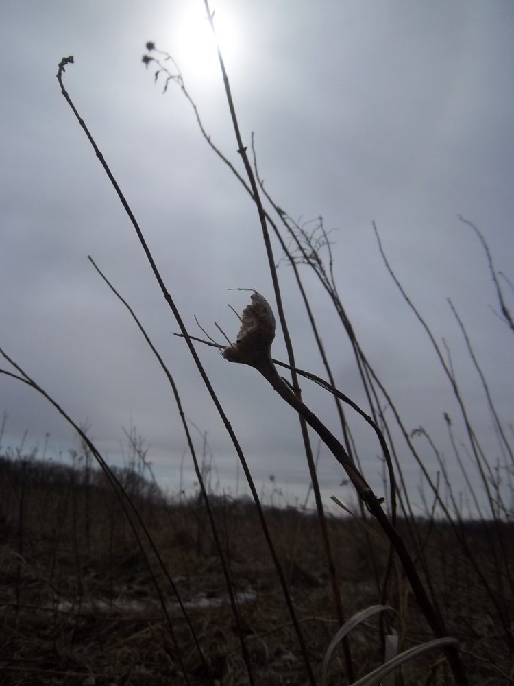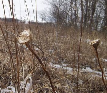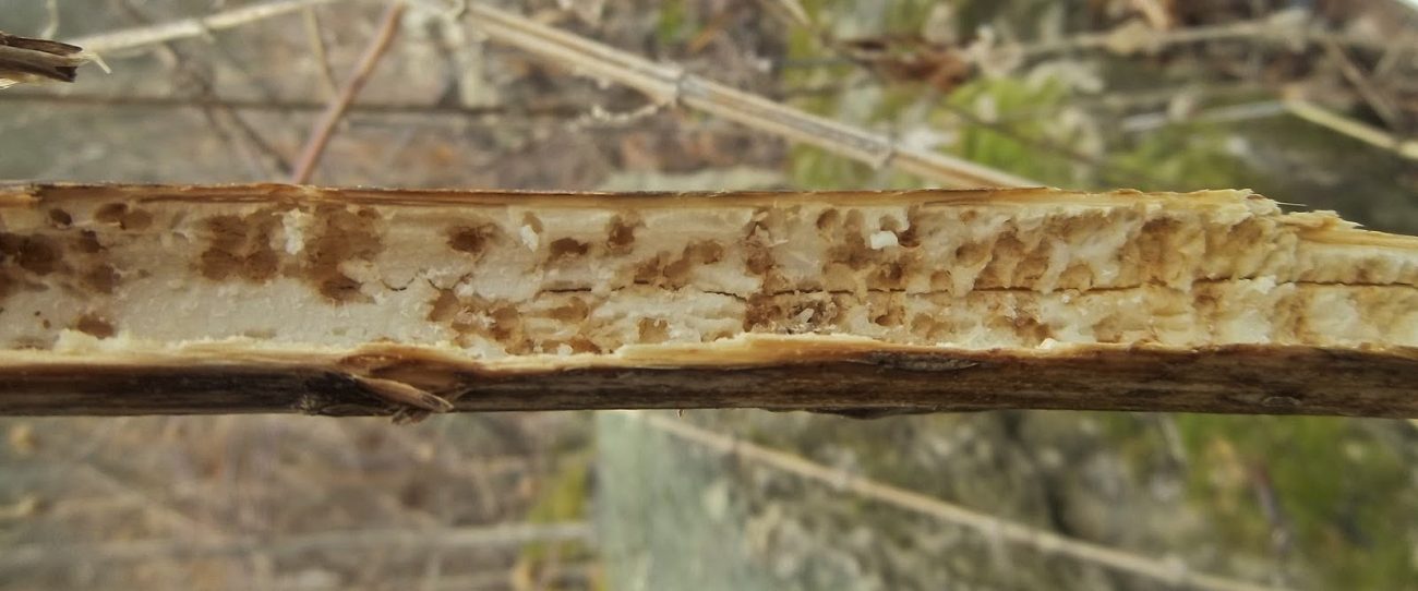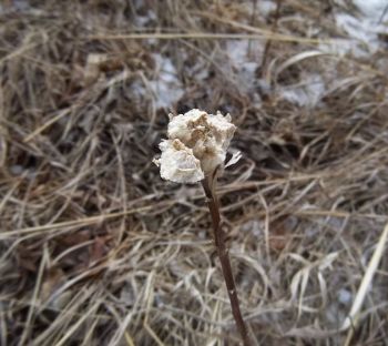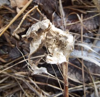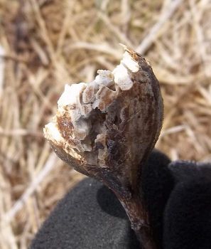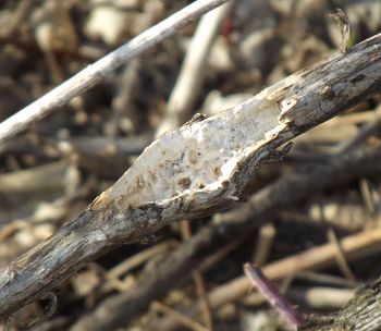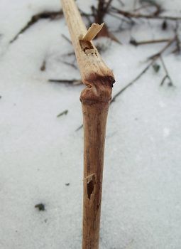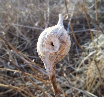 Most of the time, when I see Eurosta solidaginis galls that have been raided by a vertebrate, the culprit was a downy woodpecker or black-capped chickadee (e.g., image 7-02). However, in March and April 2013, I came across a population of galls in an old field in southwestern Minnesota that appeared to have been chewed or broken open by a mammal (images 7-04 through 7-12). I have never witnessed this again.