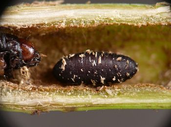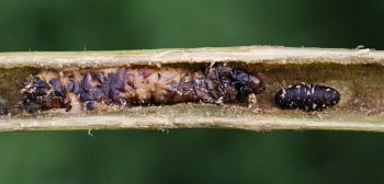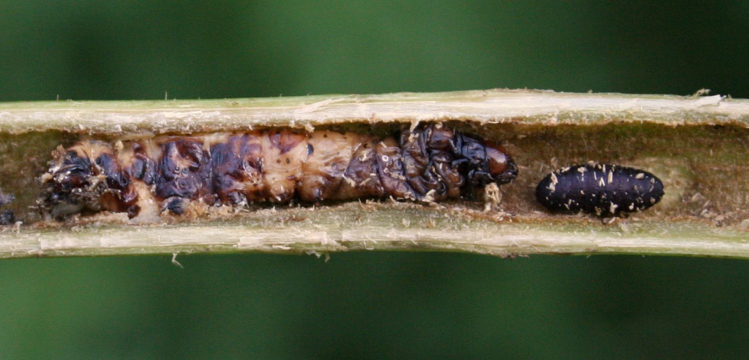 I haven't encountered very many examples of these. Images 3-01 and 3-02 show an apparent Papaipema borer larva, killed by a parasitoid fly, which emerged from the carcass of the caterpillar when it was done feeding and formed its puparium in the stem tunnel nearby.