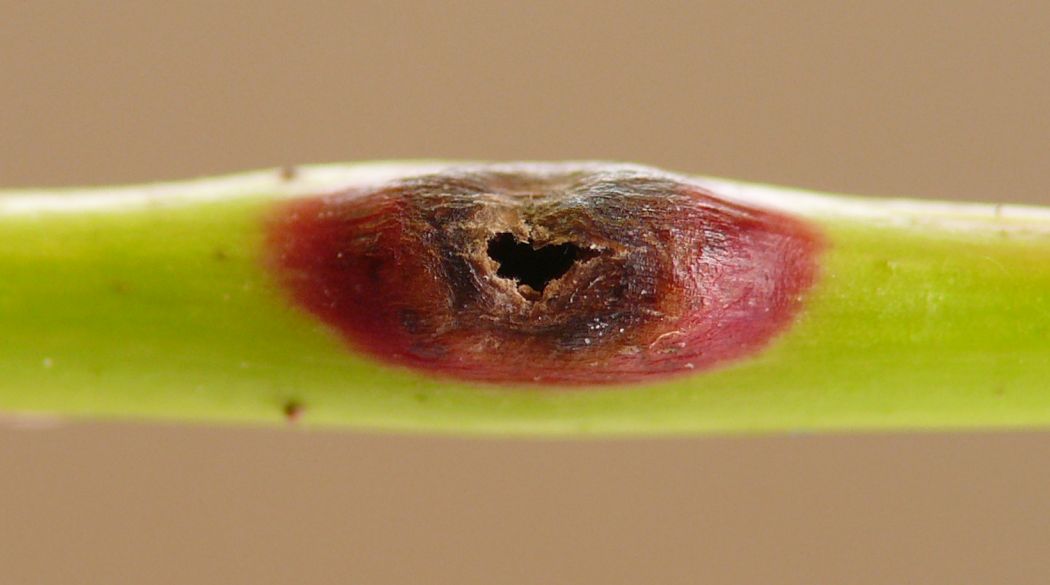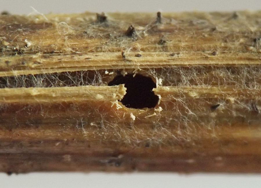 Exit slits left by mature larvae when they evacuate the stem in order to pupate off the plant. Semicircular, sometimes very neatly so; usually with fairly smooth edges when fresh, but with the hanging chad of tissue on the inside of the semicircle becoming ragged with age.