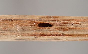 Exit holes left in stems upon the successful emergence of the adult lizard beetle. Oval, sometimes with rough and/or irregular edges, about twice as long as wide, with the long axis of the hole parallel to the long axis of the stem. Significantly larger than agromyzid exit holes.