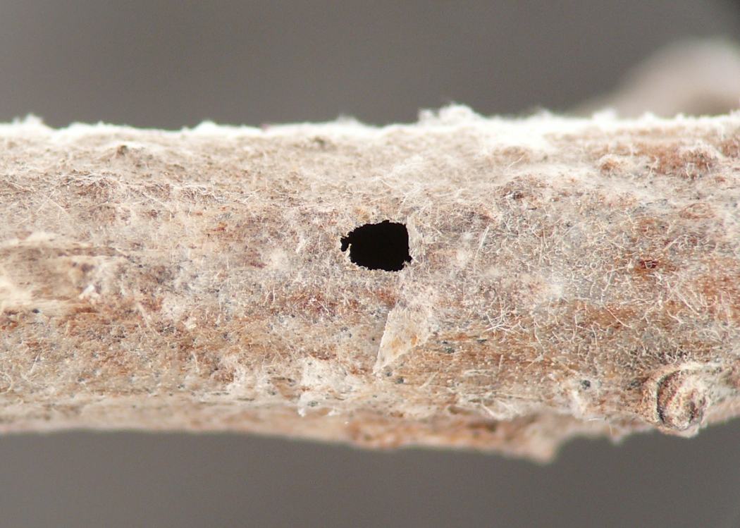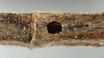Exit holes left in stems after the adult beetle emerges. Roundish to somewhat oval, one to two times as long as wide; may have rough or irregular edges. Most examples I have so far photographed were more circular and less oval in shape compared to typical Melanagromyza or Languriini exit holes.