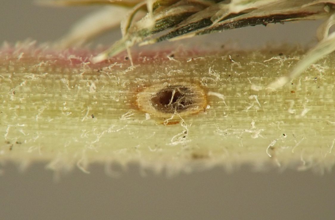 I haven't seen very many examples of either, but from what I have seen, the Clematis borer leaves a semicircular exit flap when the adult fly emerges, while the Clematis local feeder/borer establishes a round hole in a node when the mature larva exits the plant in order to pupate on the ground. The petiole miner/borer in Arnoglossum constructs an irregular, roundish to oval hole covered by an operculum of epidermis. Mature larvae of the Phlox divaricata borer evacuate the stem through a hole of which I have only observed a few examples; in the example shown here, the hole is a small, irregular oval, surrounded by a dark ring of necrotic tissue and partly obscured by the stem hairs.